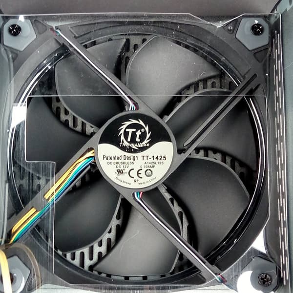 Вентилятор, установленный в блоке питания, брендирован компанией Thermaltake, однако на нем имеется и маркировка завода-изготовителя. В данном случае перед нами продукт производства компании Hong Sheng — A1425L12S. Thermaltake заявляет об использовании гидродинамического подшипника в вентиляторе данного источника питания.