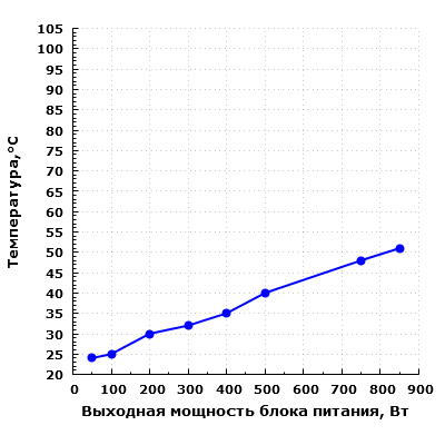 Также стоит учитывать, что в случае работы с остановленным вентилятором температура компонентов внутри БП сильно зависит от окружающей температуры воздуха, и если та установится на уровне 40-45 °C, это приведет к более раннему включению вентилятора.