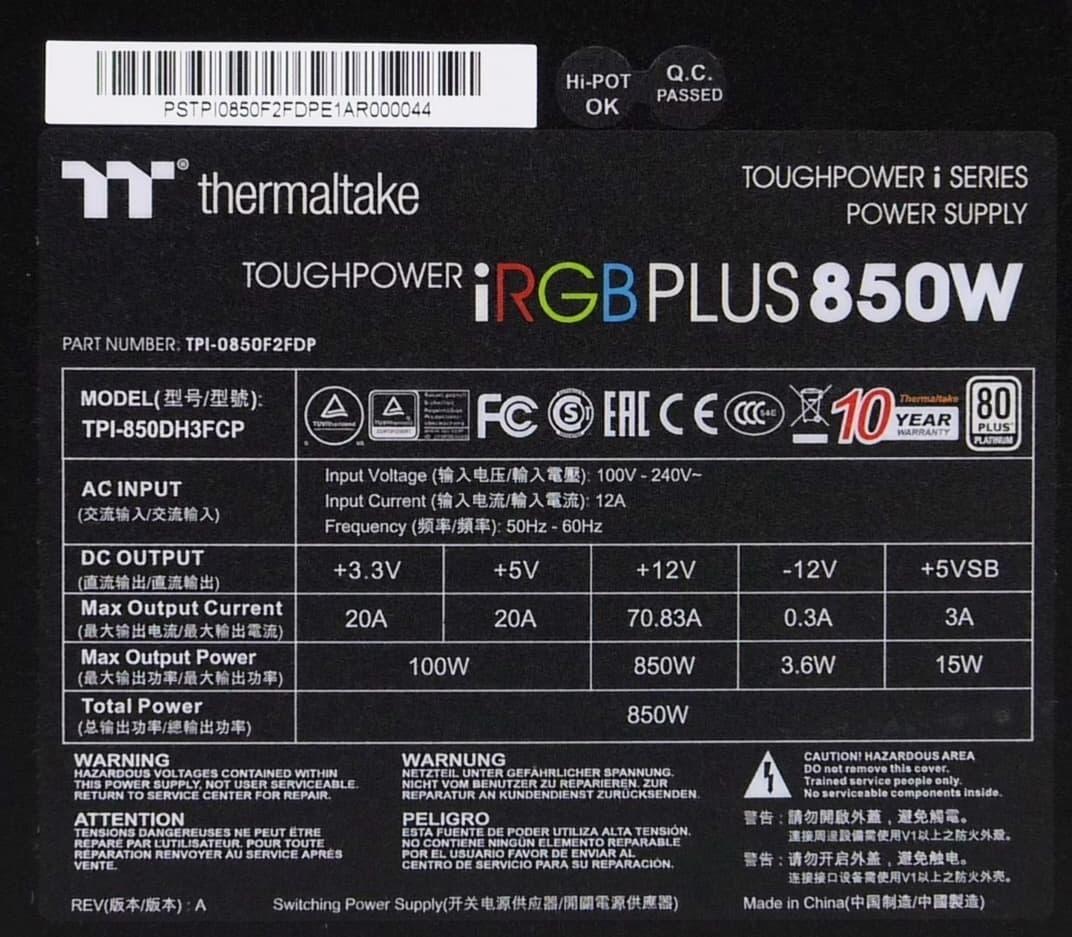 В серии Toughpower iRGB Plus представлено четыре модели БП мощностью 850, 1050, 1200 и 1250 Вт. Первые три источника питания имеют сертификат 80Plus Platinum, тогда как старшая модель получила сертификат уровня 80Plus Titanium. Впрочем, со старшей моделью мы уже знакомились в начале года. Кстати, на сайте производителя обнаруживается лишь старшая модель, если фильтровать по сериям и выбрать серию Toughpower iRGB Plus, а остальные три свалены в списке новых продуктов, поэтому найти нужную модель проще всего через Google.