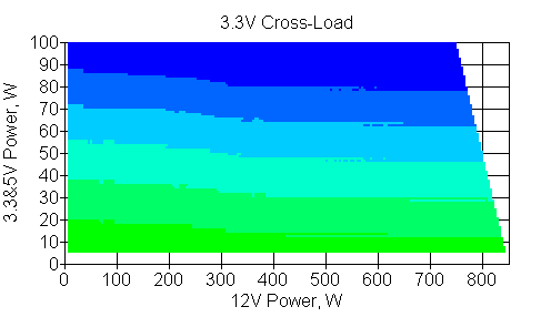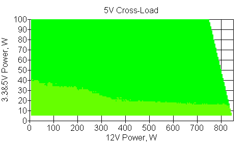 Следующим этапом инструментального тестирования является построение кросснагрузочной характеристики (КНХ) и представление ее на четвертьплоскости, ограниченной максимальной мощностью по шине 3,3&5 В с одной стороны (по оси ординат) и максимальной мощностью по шине 12 В с другой (по оси абсцисс). В каждой точке измеренное значение напряжения обозначается цветовым маркером в зависимости от отклонения от номинального значения.