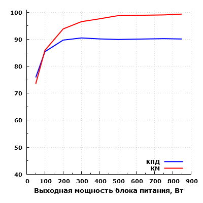 Эффективность БП находится на достойном уровне. Согласно нашим измерениям, КПД данного блока питания достигает значения свыше 90% в диапазоне мощности от 300 до 850 ватт. Максимальное зарегистрированное значение составило 90,5% на мощности 300 Вт. Одновременно с этим, КПД на мощности 50 Вт составил 75,9%.