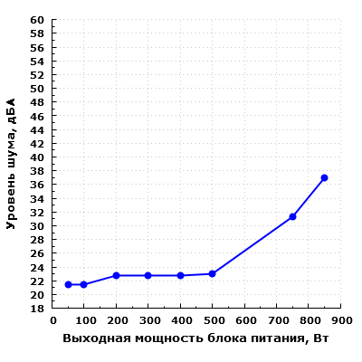 При работе в диапазоне до 500 Вт включительно шум блока питания находится на минимально заметном уровне — в пределах 23 дБА с расстояния 0,35 метра. Работающий вентилятор в данных режимах не ухудшит общую акустическую эргономику компьютера даже ночью.