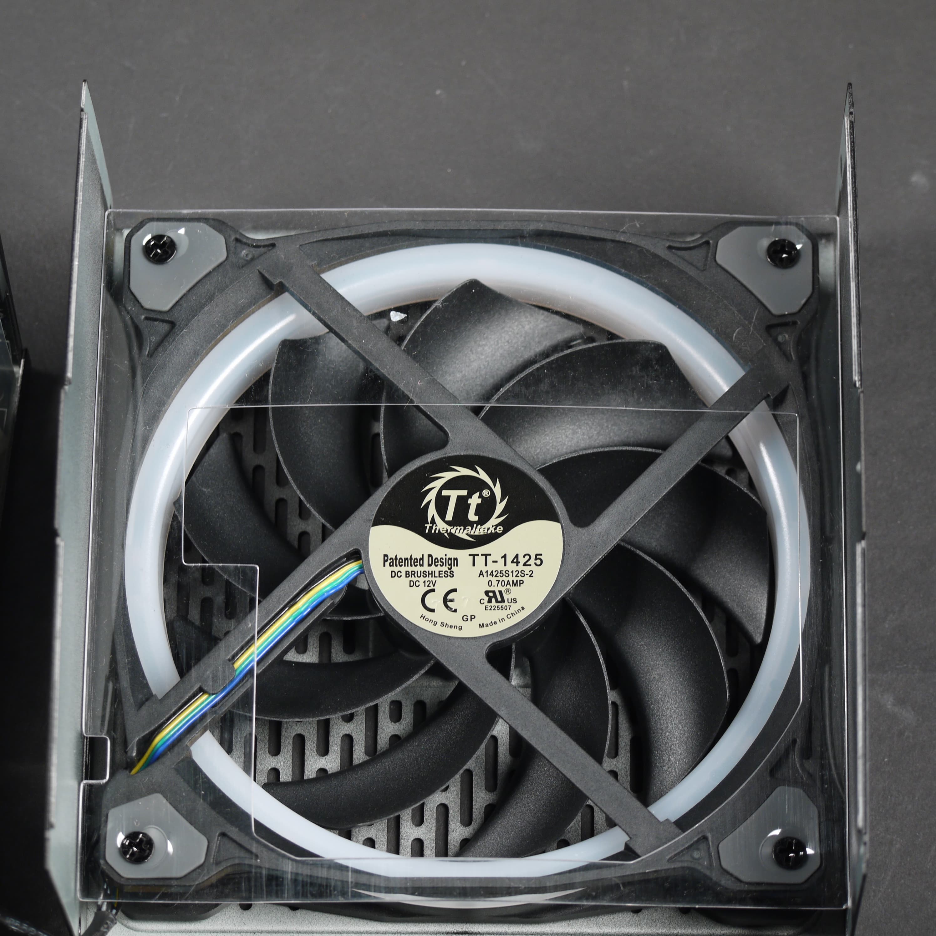 Вентилятор, установленный в блоке питания, брендирован компанией Thermaltake, однако на нем имеется и маркировка завода-изготовителя. В данном случае перед нами продукт производства компании Hong Sheng — A1425L12S. Thermaltake заявляет об использовании гидродинамического подшипника в вентиляторе данного источника питания.