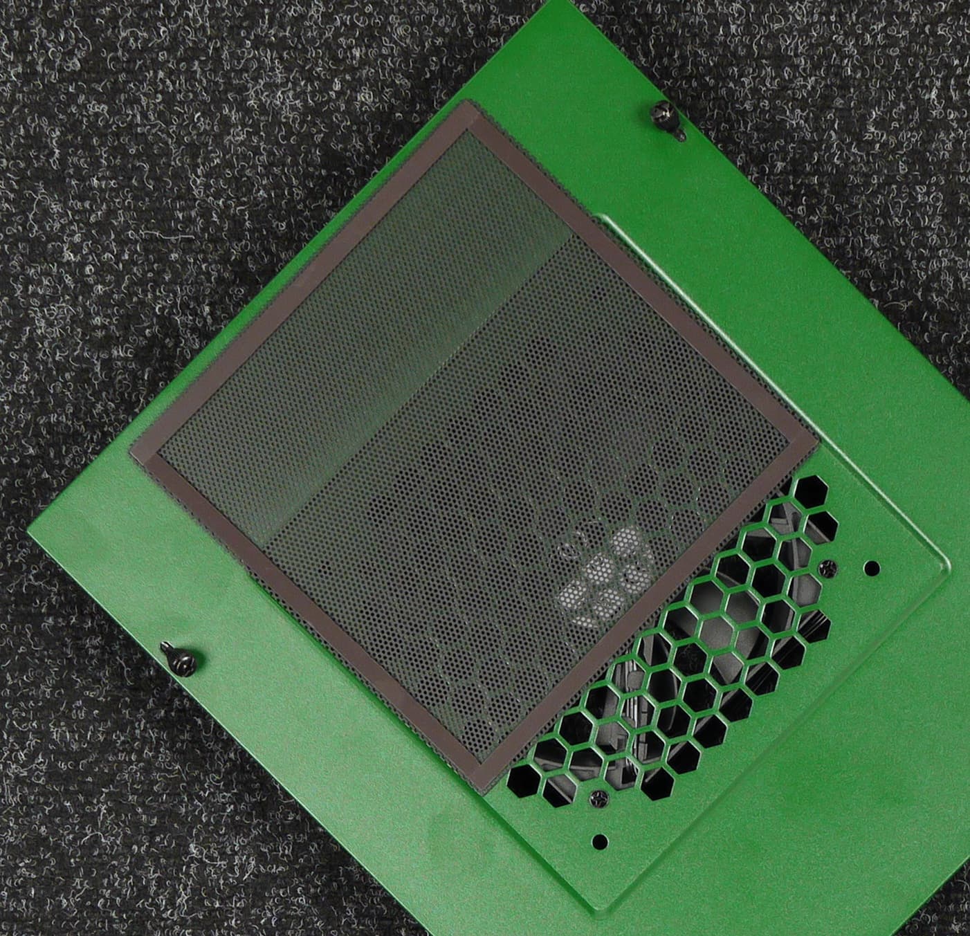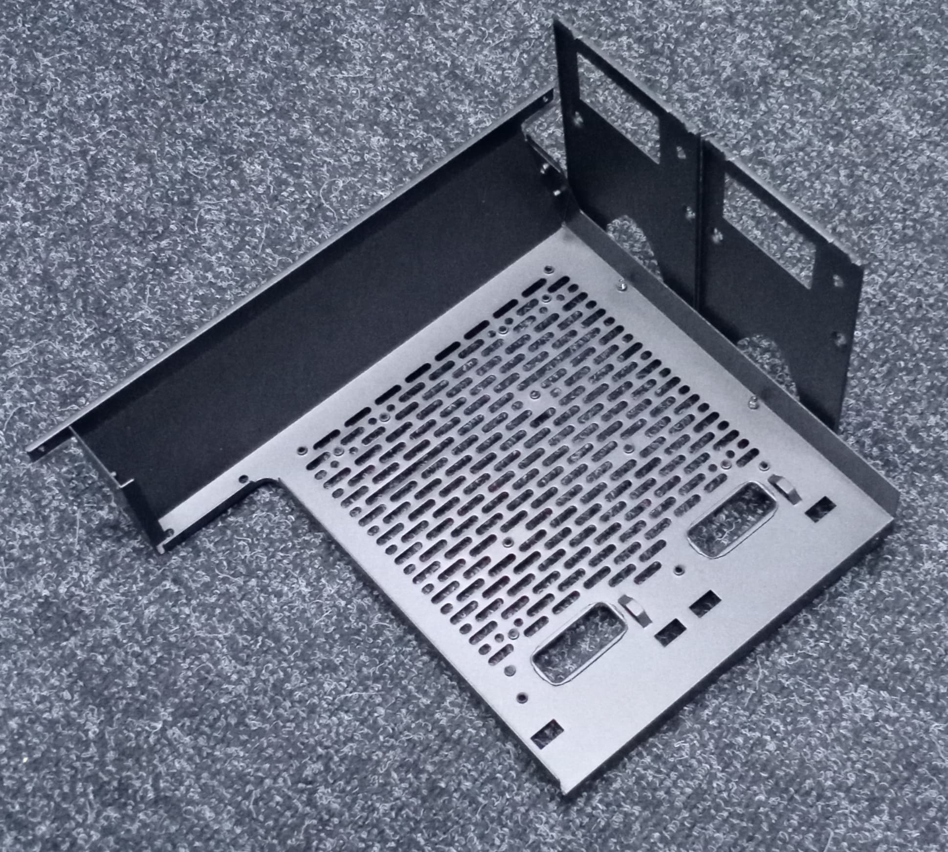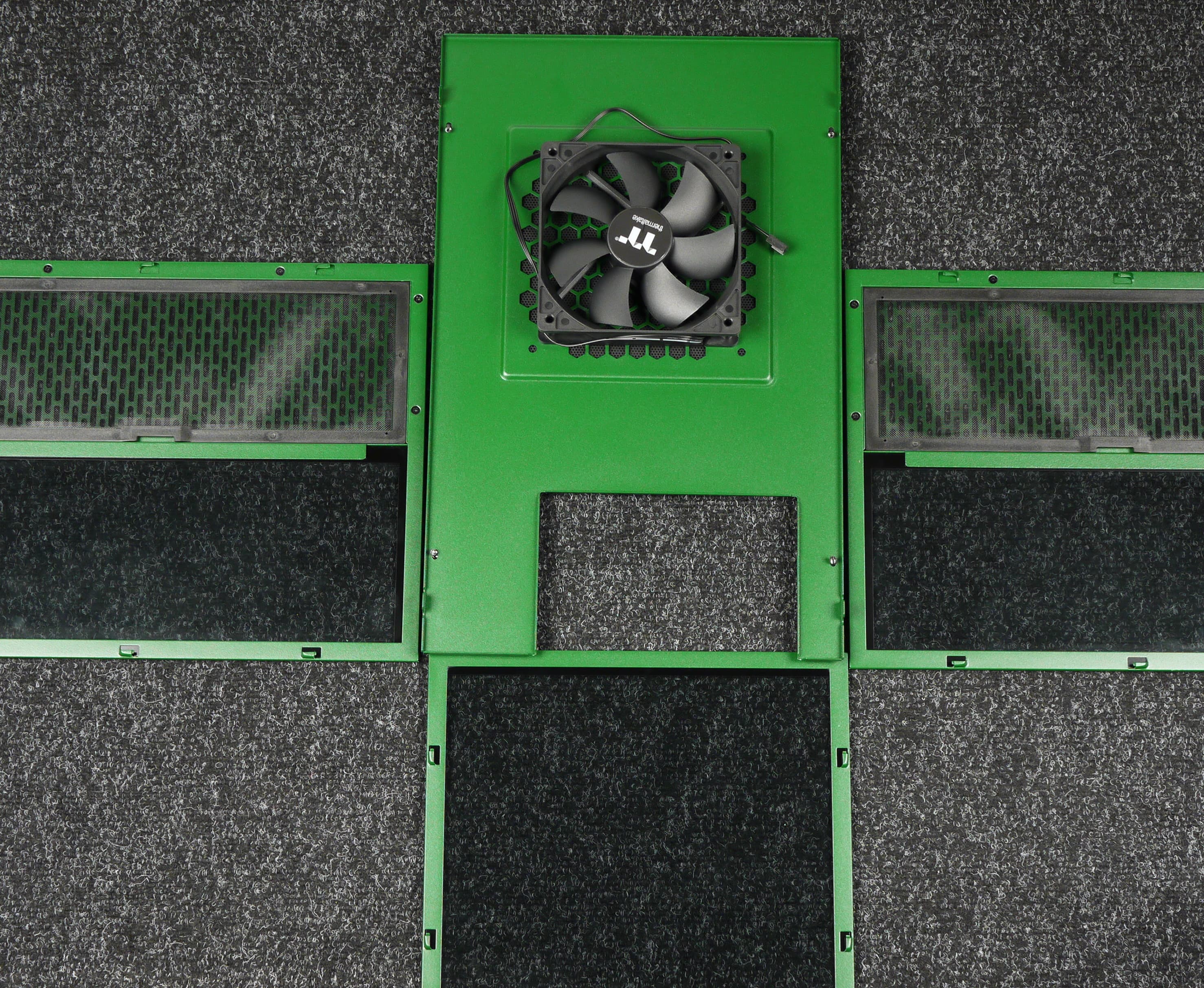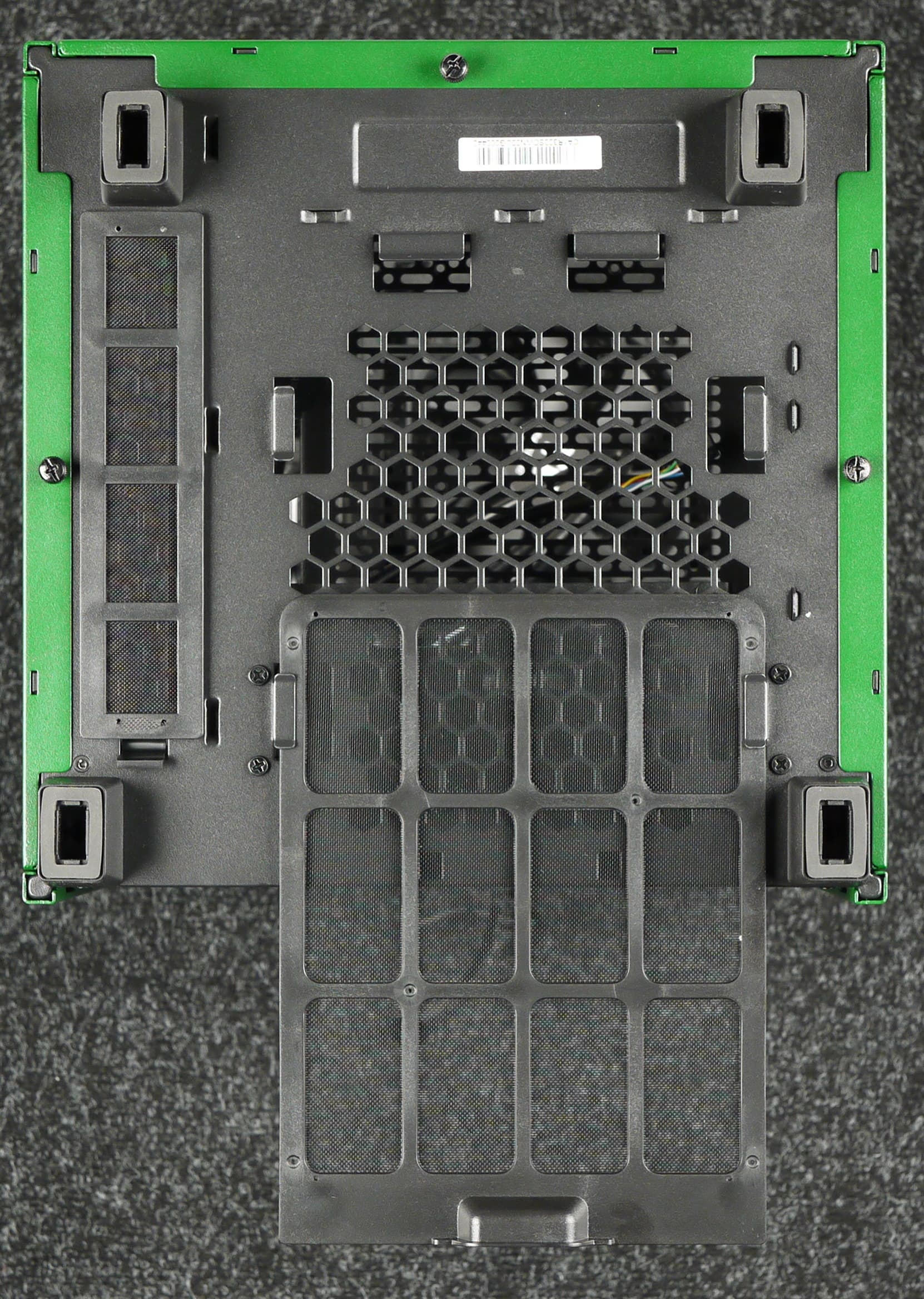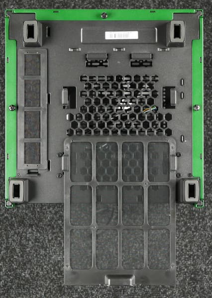 На боковых и передней стенках шасси установлены по две панели: сверху и снизу. Нижняя панель представляет собой штампованную деталь из стали с решеткой посередине, под которой располагается пылевой фильтр.