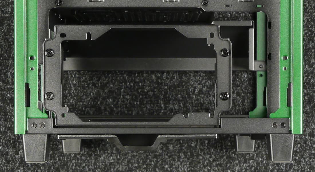 Еще одна зона для установки накопителей расположена под правой стенкой на кожухе блока питания. В этом месте предусмотрена установка двух накопителей при помощи съемных монтажных пластин, которые фиксируются при помощи гребней и ответных пазов, а также одного винта под крестовую отвертку, вкручиваемого в верхнюю часть кожуха БП.