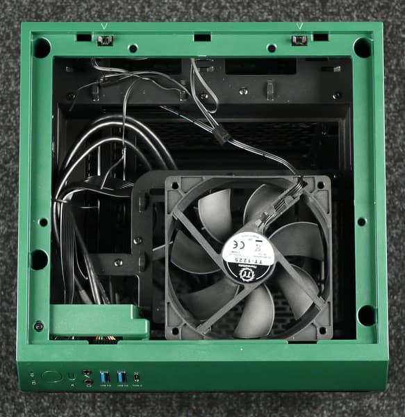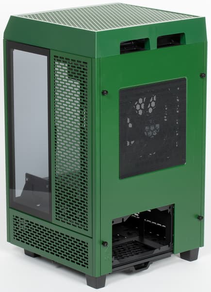 Корпус представляет собой решение башенного типа с вертикально размещаемой платой формата Mini-ITX и и нижнерасположенным блоком питания с горизонтальным размещением на дне корпуса около задней стенки. Блок питания может быть формата ATX, но при желании можно установить и SFX-модель через адаптер.