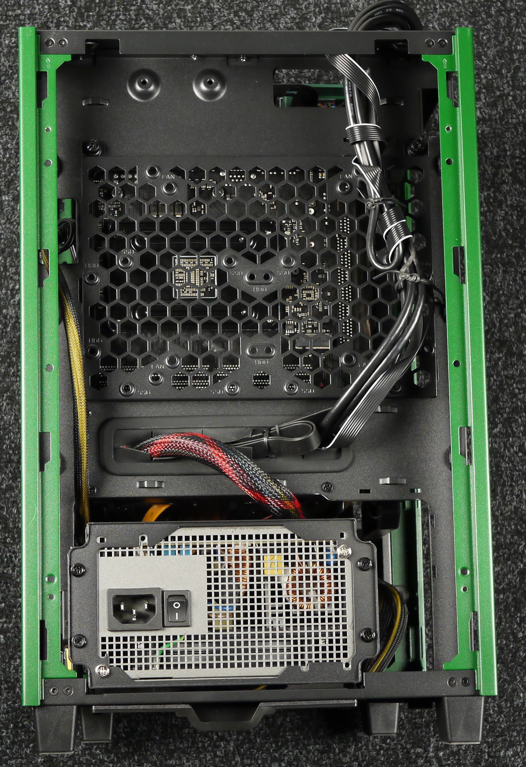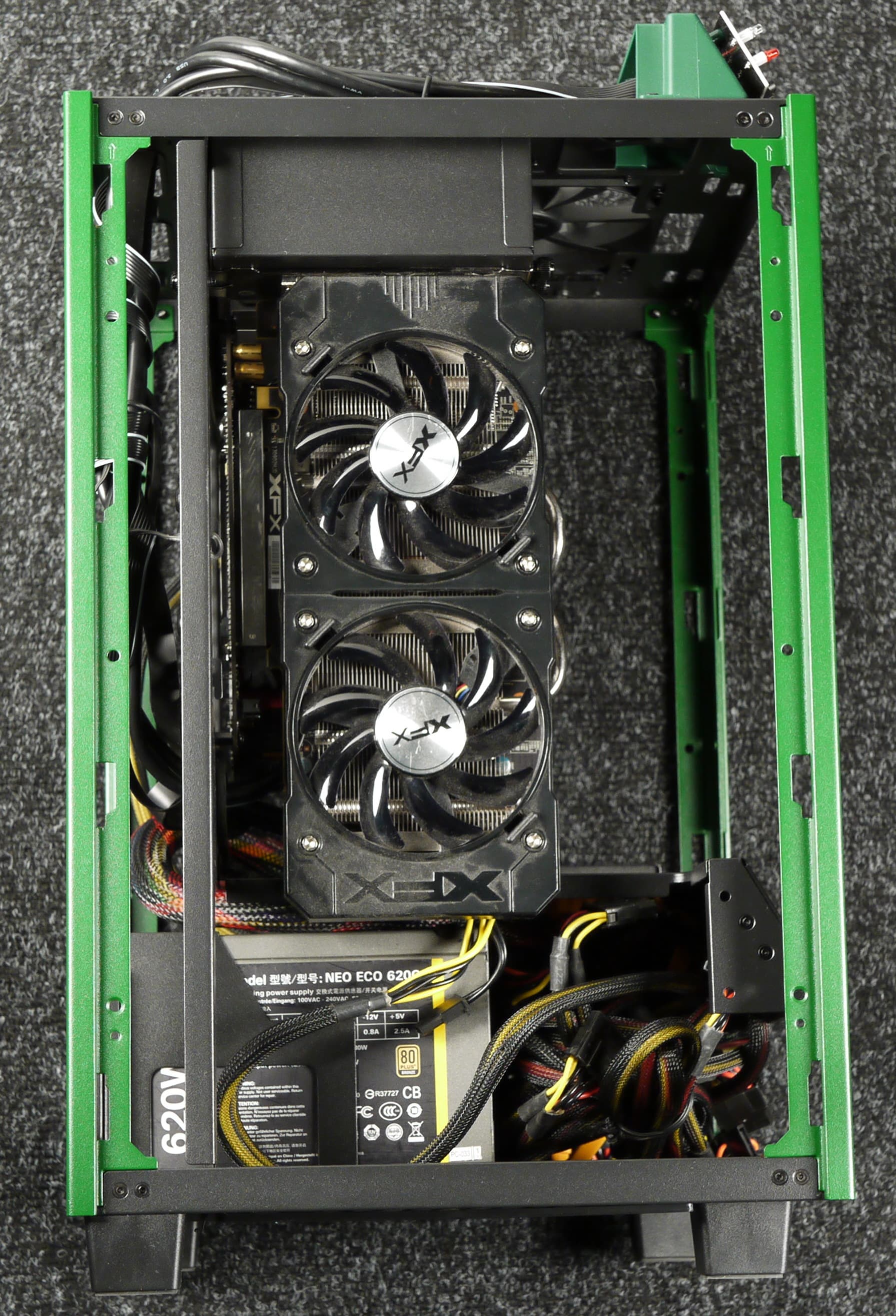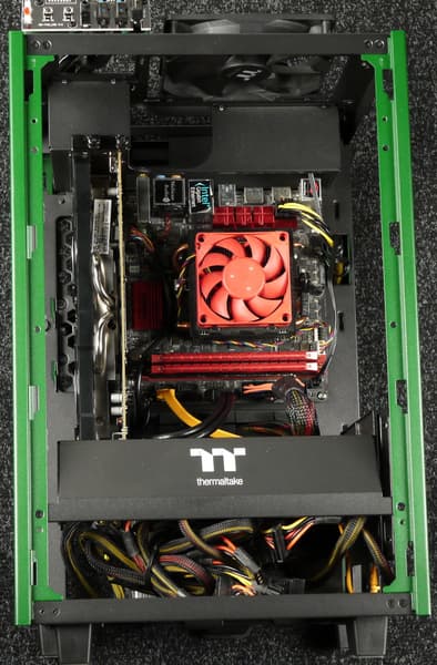 Системная плата установлена вертикально, но повернута на 90 градусов относительно стандартного варианта размещения так, что смотрит портами вверх. Соответственно, все платы расширения, включая и видеокарту, также будут расположены портами вверх. Блок питания устанавливается вполне стандартно — внизу горизонтально.