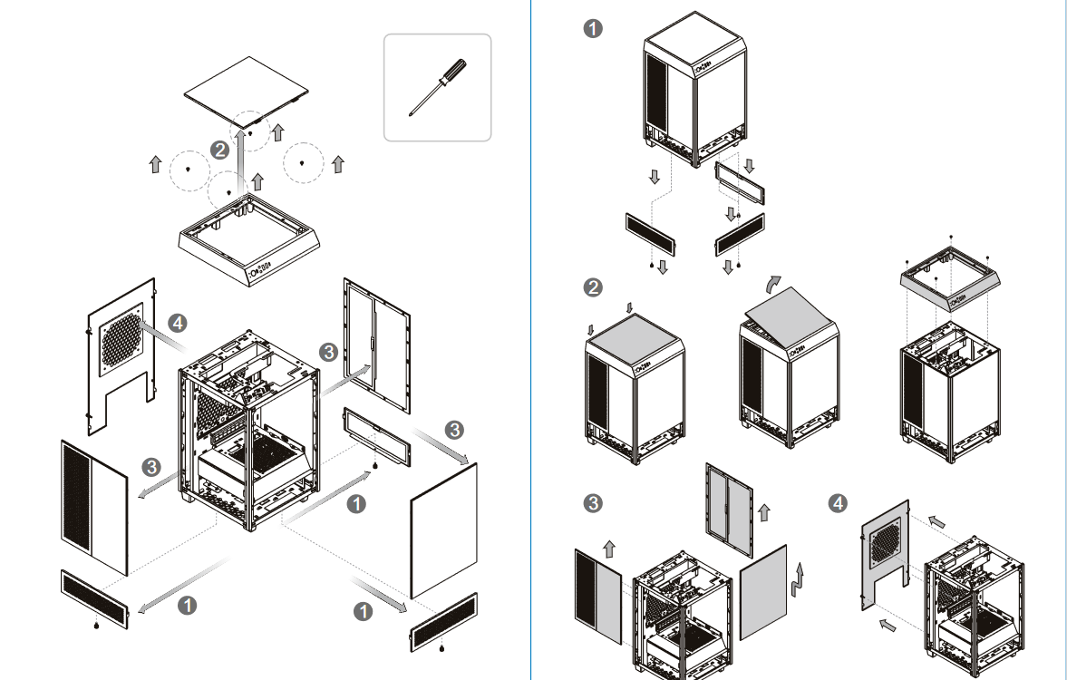 Подавляющее большинство компактных корпусов при сборке требуют большего количества манипуляций и затраченного времени по сравнению со сборкой в полноразмерных моделях. Сборка в данном случае начинается с почти полной разборки корпуса для дальнейшей установки компонентов системного блока и последующей сборки корпуса в обратной последовательности.