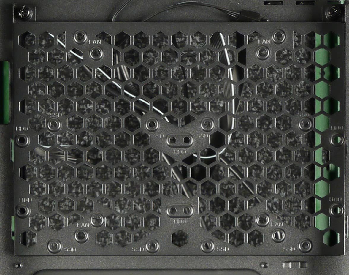 Кожух частично закрывает место установки блока питания, придавая внутреннему виду корпуса аккуратность и законченность. Именно это и является его основной функцией — прятать блок питания с проводами. Кожух не полноразмерный, а также на нем присутствует большое количество вентиляционных отверстий.