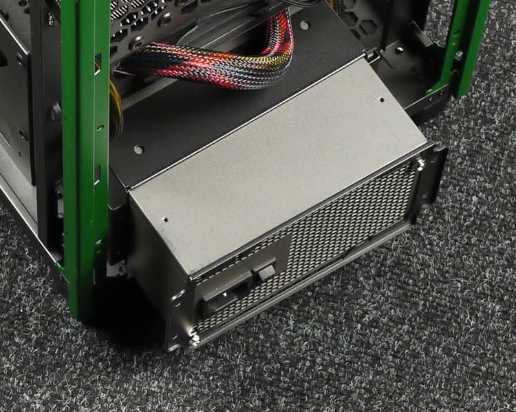 БП формата ATX фиксируется при помощи четырех винтов на монтажной рамке, после чего он заводится в корпус со стороны задней панели. Корпус предусматривает установку блоков питания с длиной корпуса до 180 мм (по заявлению производителя). Мы рекомендуем использовать БП с корпусом длиной не более 140 мм, так как в этом случае останется больше места для укладки неиспользуемых проводов.