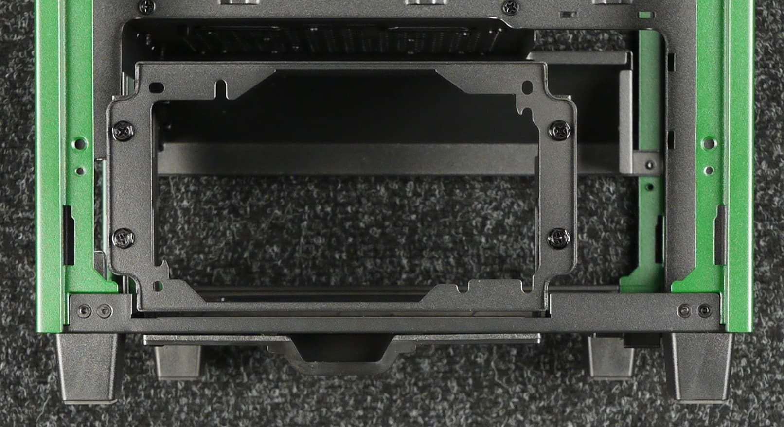Нижние сегменты снимаются независимо от верхних, для этого необходимо открутить один винт со стороны дна корпуса, после чего стенка опустится и ее можно будет легко снять. А вот установить эти стенки назад уже сложнее, и удобнее это делать, когда корпус лежит на задней панели — в этом случае штатные винты выступают в роли миниатюрных ножек, приподнимая корпус над поверхностью стола.