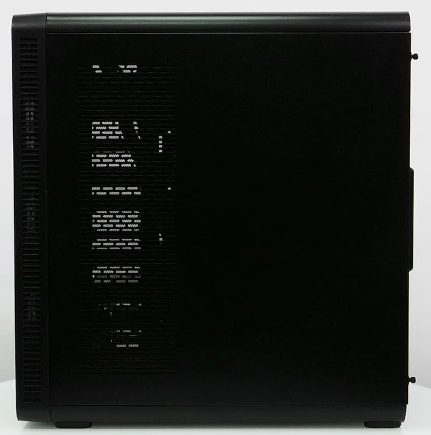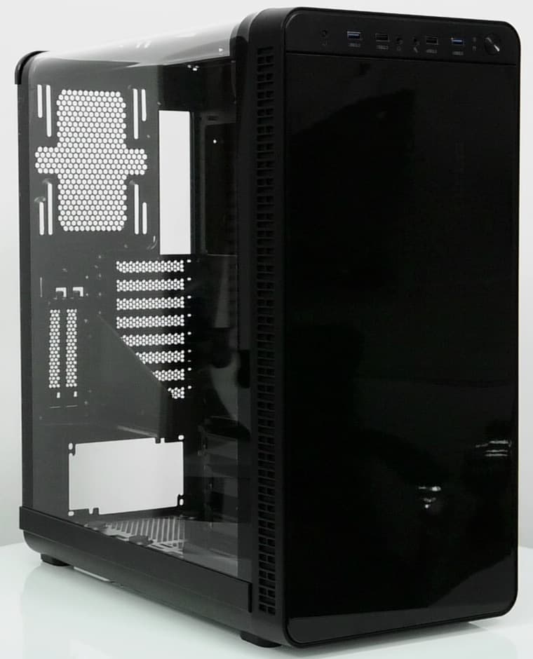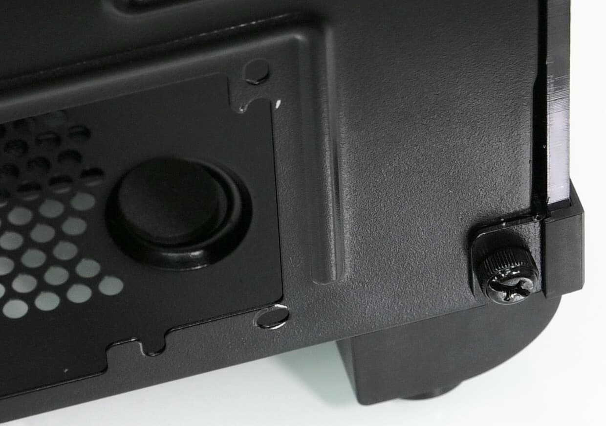 Оригинальным решением является использование прозрачной панорамной панели, которая прикрывает корпус с двух сторон — сверху и слева. Панель выполнена из толстой пластмассы и имеет высокую прочность и относительно высокую жесткость на скручивание. Крепление у нее прислонно-сдвижного типа с фиксацией двумя винтами с накатной головкой со стороны задней панели.