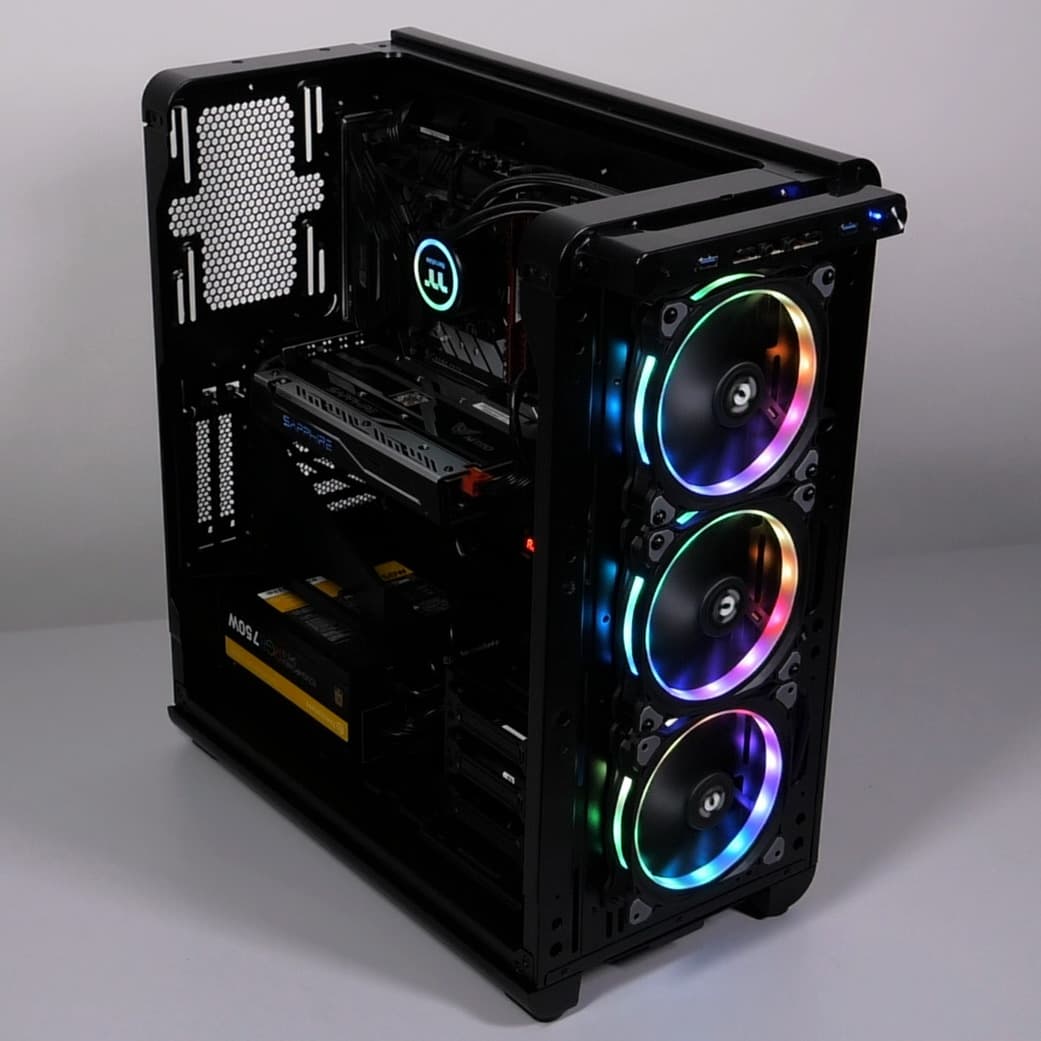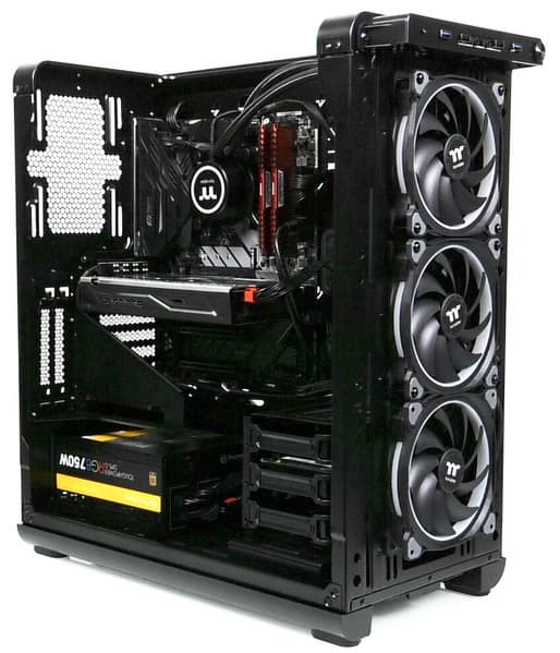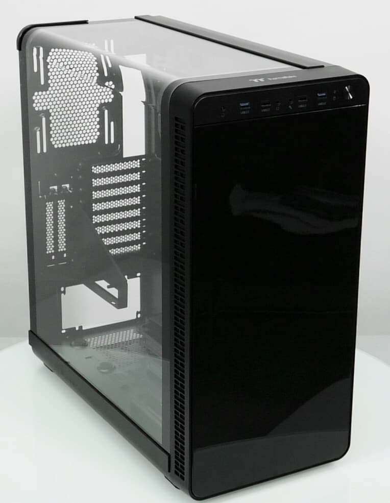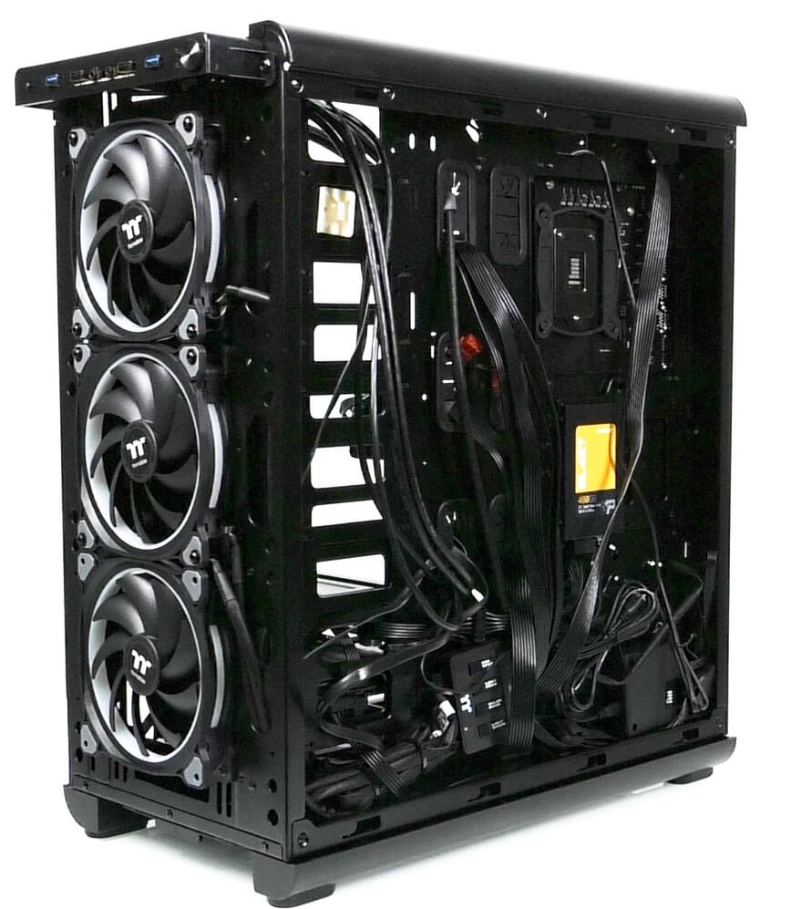 Thermaltake View 37 RGB Edition оставил хорошее впечатление не только из-за интересного и действительно оригинального дизайна, но из-за достойного исполнения в металле, что бывает не так уж часто. Шасси у корпуса довольно простое, но это и хорошо, так как оно позволяет удобно манипулировать внутри при сборке или иных действиях. Отдельно упомянем комплектный контроллер управления вентиляторами с возможностью управления от совместимых системных плат, а также три предустановленных вентилятора с подсветкой. Некоторой доработки требует конструкция панорамной панели, которая не всегда функционирует без нареканий. Есть небольшие претензии и к пылевым фильтрам. Серьезных недостатков у корпуса мы не выявили.