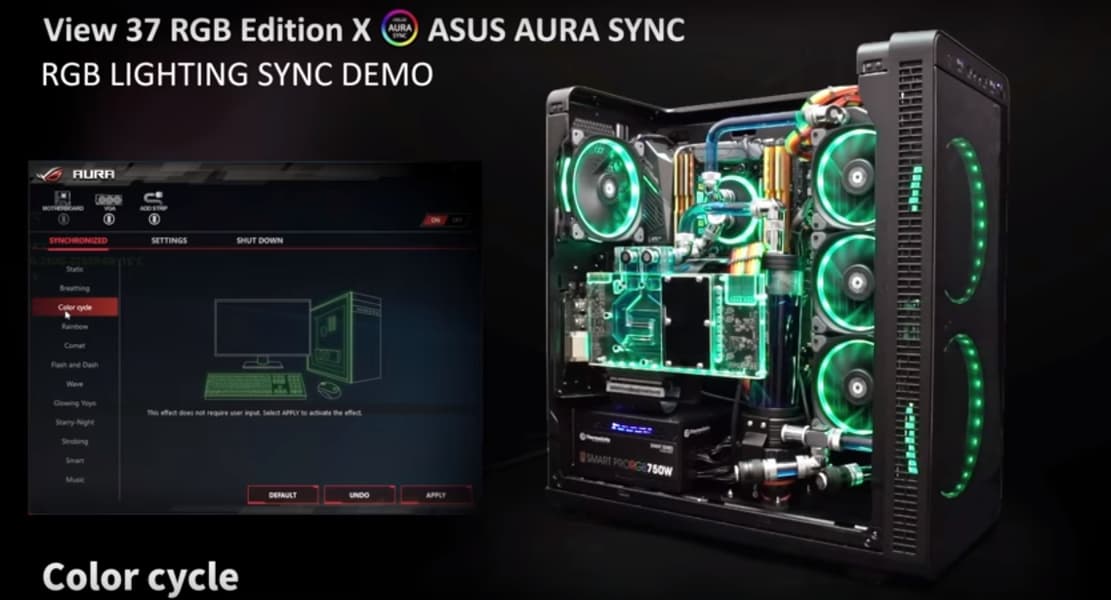 В корпусе реализована разветвленная система подсветки, которая включает три вентилятора с кольцевой подсветкой и контроллер с возможностью расширения. В модификации View 37 RGB Edition (которую мы тестировали) корпус оснащен тремя вентиляторами Riing Plus с 12 адресуемыми светодиодами в каждом, которые и обеспечивают RGB-подсветку. Еще существует модификация Riing Edition, которая оснащена двумя вентиляторами с одноцветной (синей) подсветкой.
