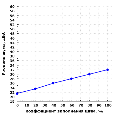 Уровень шума системы охлаждения изменяется от 25,5 до 39 дБА при расположении микрофона в ближнем поле. При значении коэффициента заполнения ШИМ менее 20% шум системы охлаждения корпуса находится на пониженном уровне, а при КЗ от 40% до 80% шум среднетипичный для жилого помещения в дневное время суток.