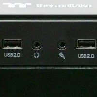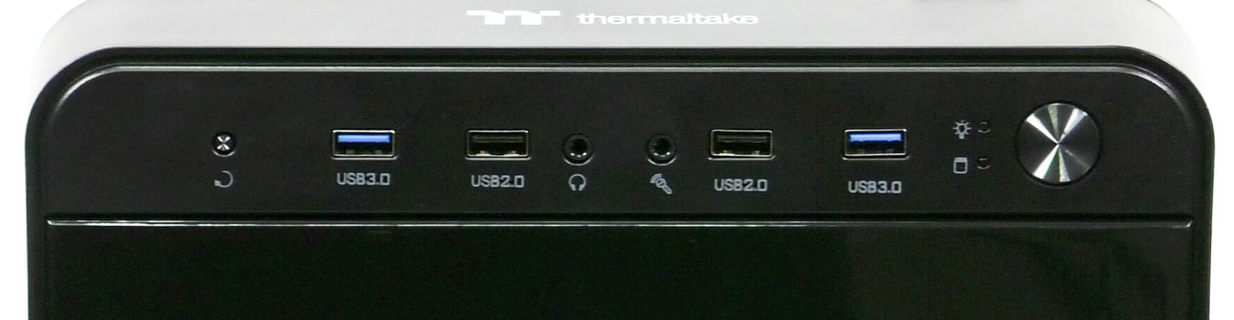 В верхней части передней панели имеется стандартный блок кнопок и разъемов: два порта USB 2.0, два порта USB 3.0 (причем расстояние между двумя ближайшими портами — около 15 мм, что позволяет использовать широкие устройства), разъемы для подключения микрофона и наушников, небольшая круглая кнопка сброса с рабочим ходом средней глубины и круглая кнопка включения, расположенная справа. Кнопки удобные, претензий к ним нет. Индикатор активности накопителей (красного цвета) и индикатор питания (синего цвета) размещены около кнопки включения.