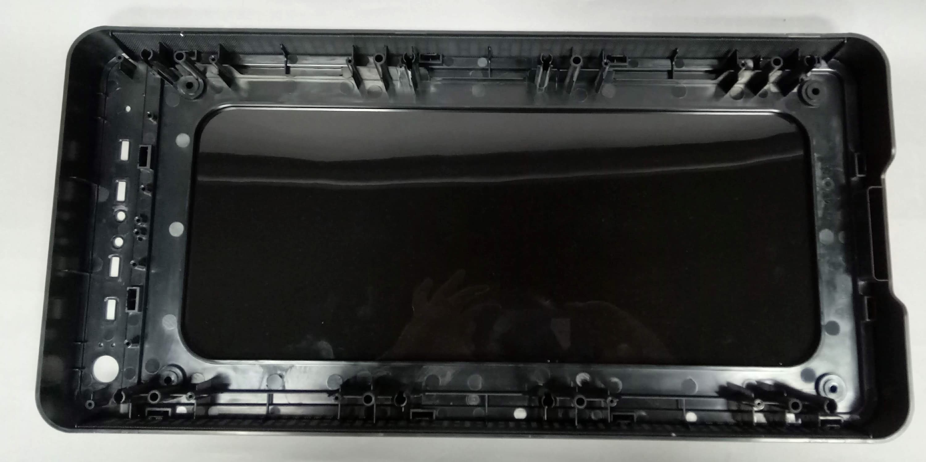 Для улучшения фиксации панорамной панели, особенно при транспортировке, предусмотрена пластиковая накладка, которая фиксируется четырьмя винтами под крестовую отвертку. Помимо того, что данная деталь улучшает фиксацию панорамной панели, также она закрывает собой щель между нею и шасси корпуса в районе изгиба.