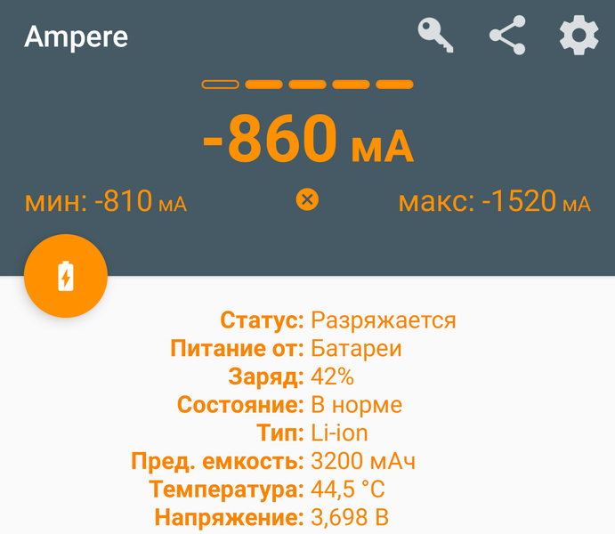 Если посмотреть документацию на литий-ионные аккумуляторы, то рекомендованный их производителями максимум рабочих температур при заряде — 45-50 °C (мы наблюдали в пределах 40 °C), а при разряде — и вовсе 55-60 °C (показания датчика в процессе работы от батареи могут достигать 44 и чуть более градусов).