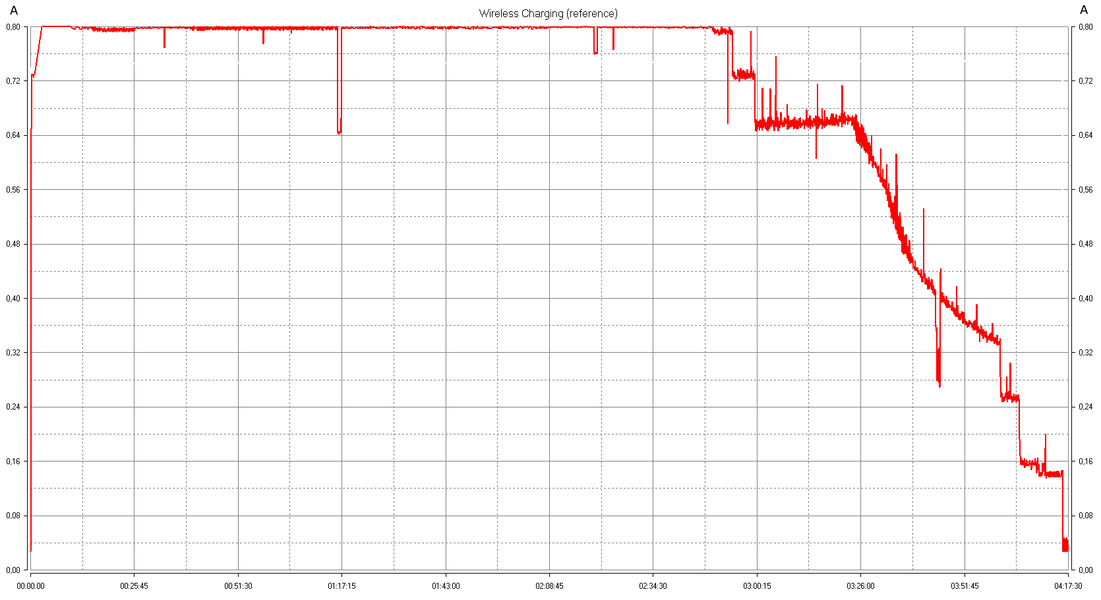 На этапе передачи энергии происходит взаимодействие между приемником и передатчиком для отслеживания состояния и поддержания процесса на оптимальном уровне: если, например, мобильное устройство снизило потребление, то базовая станция должна уменьшить и уровень «подкачки». Поэтому происходит постоянный обмен данными, который, как сказано выше, физически реализован модуляцией магнитного поля, соответственно и потребляемый BS от сетевого адаптера ток (или мощность) все время будет меняться в небольших пределах, даже если нагрузка приемника неизменна. Собственно, это мы и увидели во время тестов, поэтому не удивляйтесь указанию не значений, а диапазонов.