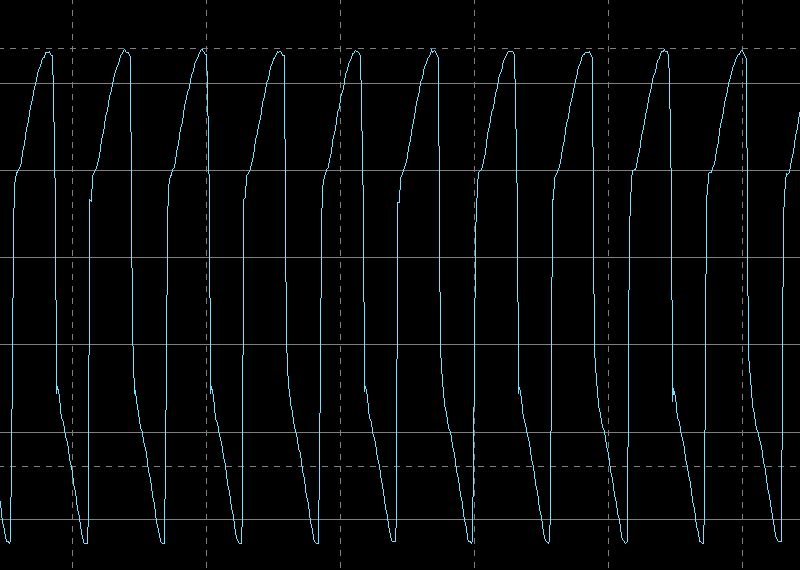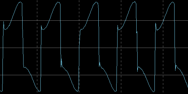 Осциллограф мы подключили непосредственно к контактам катушки приемника измерителя, благо они доступны. На всех приведенных ниже осциллограммах цена деления 5 В по вертикали и 10 мкс по горизонтали.