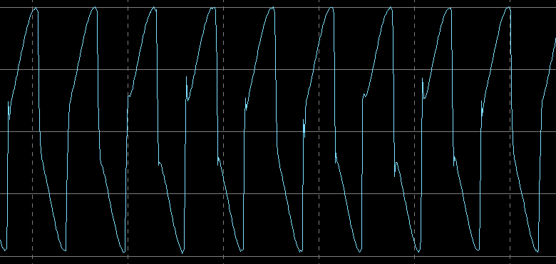 По сравнению со случаем без нагрузки при 5,5 Вт частота уменьшилась до 100 кГц, размах остался практически таким же, но существенно изменилась форма импульсов. При 10 Вт частота приблизилась к 175 кГц, размах изменился незначительно, но форма снова иная; при увеличении до 13 Вт частота и форма почти не менялись, но размах превысил 30 В.