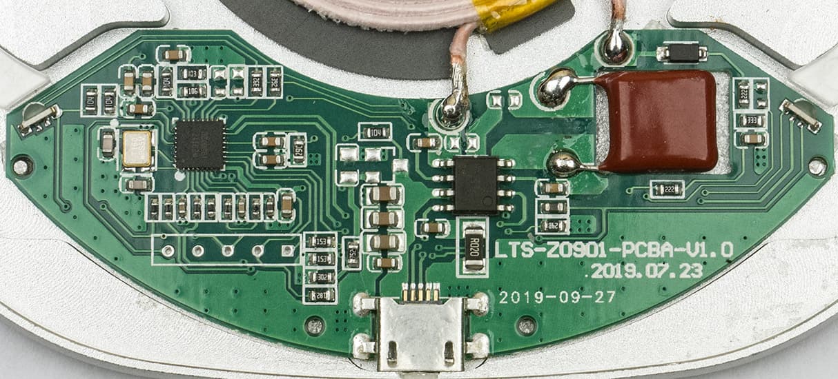 Первая — WE9117, Qi-совместимый контроллер для беспроводных зарядных устройств. Полный datasheet на него найти не удалось, а доступное краткое описание говорит, что он содержит цепи коммуникации (очевидно, с приемником MD) и управления (в том числе передаваемой мощностью), обеспечивает взаимодействие с адаптерами Quick Charge и распознавание посторонних предметов (FOD). Отмечается, что он совместим с катушкой передатчика типоразмера А11 по спецификации Qi.