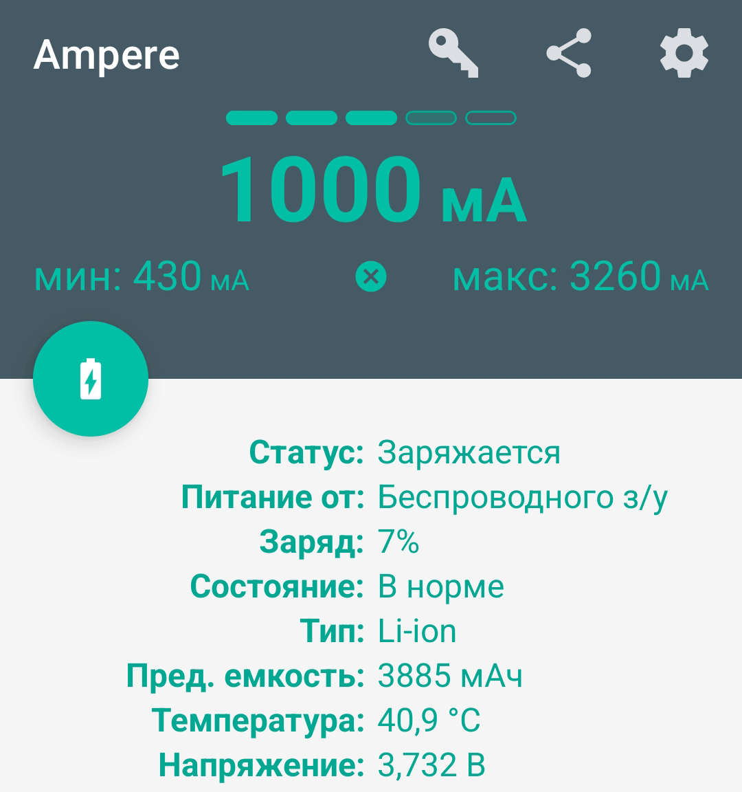 Задействуется 9-вольтовый режим, потребляемый смартфоном ток в начале процесса достигает 1,2-1,3 А, при этом приложение Ampere показывает, что аккумулятор заряжается током около 2,4 ампера (начинает понемногу снижаться лишь через 40-45 минут); температура была чуть меньше, чем при беспроводной зарядке — в пределах 41 °C.