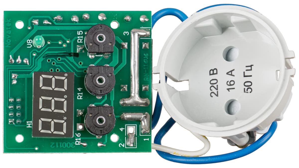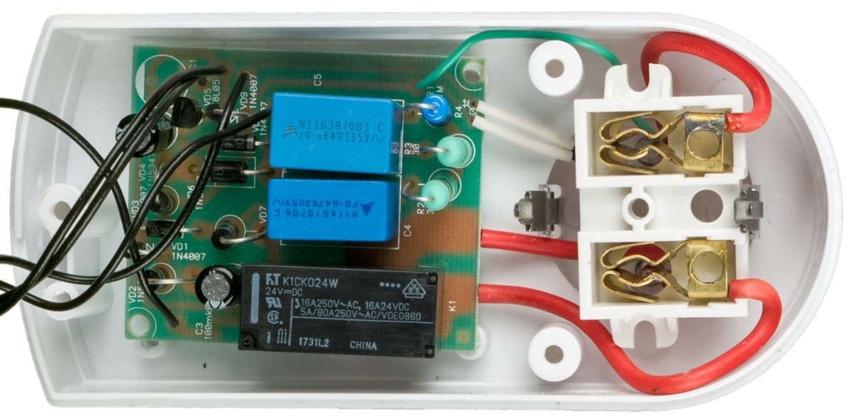 Заявлено, что схемотехника обеспечивает коммутацию нагрузки максимально близко к моменту перехода синусоиды напряжения через ноль, чтобы уменьшить искрение контактов и увеличить срок службы реле. Теоретически это неплохо, но практически вряд ли может быть реализовано в подобном устройстве: электроника может отследить нужный момент и подать команду на электромагнитное реле, но время срабатывания конкретного экземпляра реле всё равно точно не известно, а потому замыкание или размыкание контактов произойдёт в произвольной точке синусоиды. Это мы проверим во время тестирования.