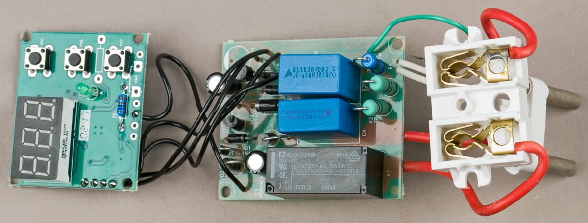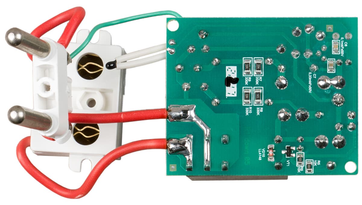 На силовой плате находятся два выпрямителя на дискретных диодах, несколько конденсаторов (гасящих и сглаживающих), а также электромагнитное реле и управляющий им транзистор.