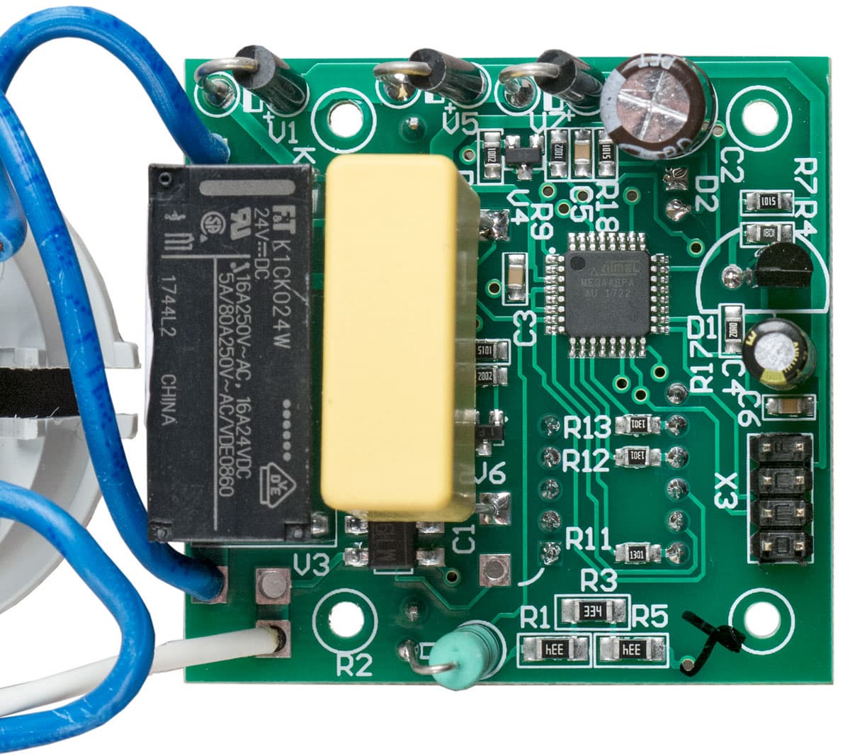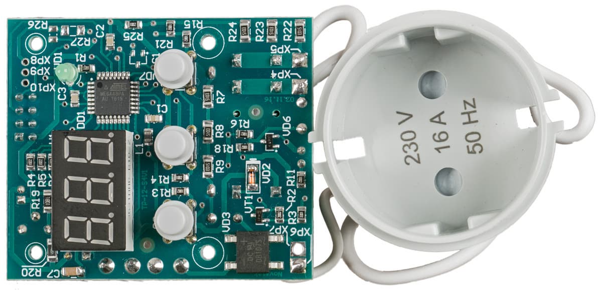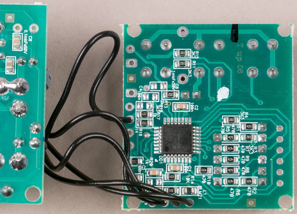 Слаботочная плата содержит контроллер ATmega88PA, кнопки и индикатор. На размере этой платы явно сэкономили: отверстия под крепежные саморезы пришлось делать настолько близко к краям, что кое-где они частично вышли за контур платы; если усердно нажимать на кнопки, плата в местах крепления может попросту надломиться.