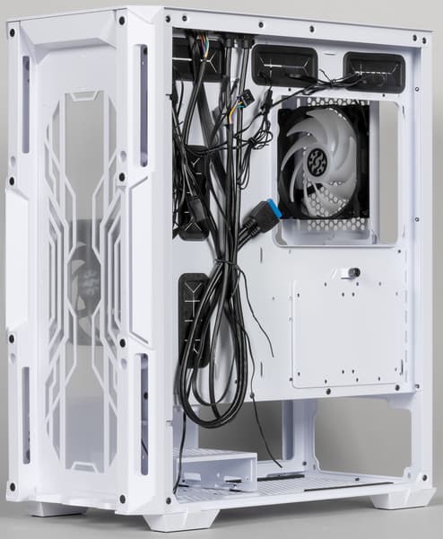 Компоновочные решения данной модели определяются современными тенденциями корпусостроения. В данном случае разработчики отказались от отсека для устройств формата 5,25″, а привычный отсек для устройств 3,5″ расположен около передней стенки шасси, но присутствует он в усеченном виде — всего на два диска. При желании его можно снять или передвинуть, открутив винты.