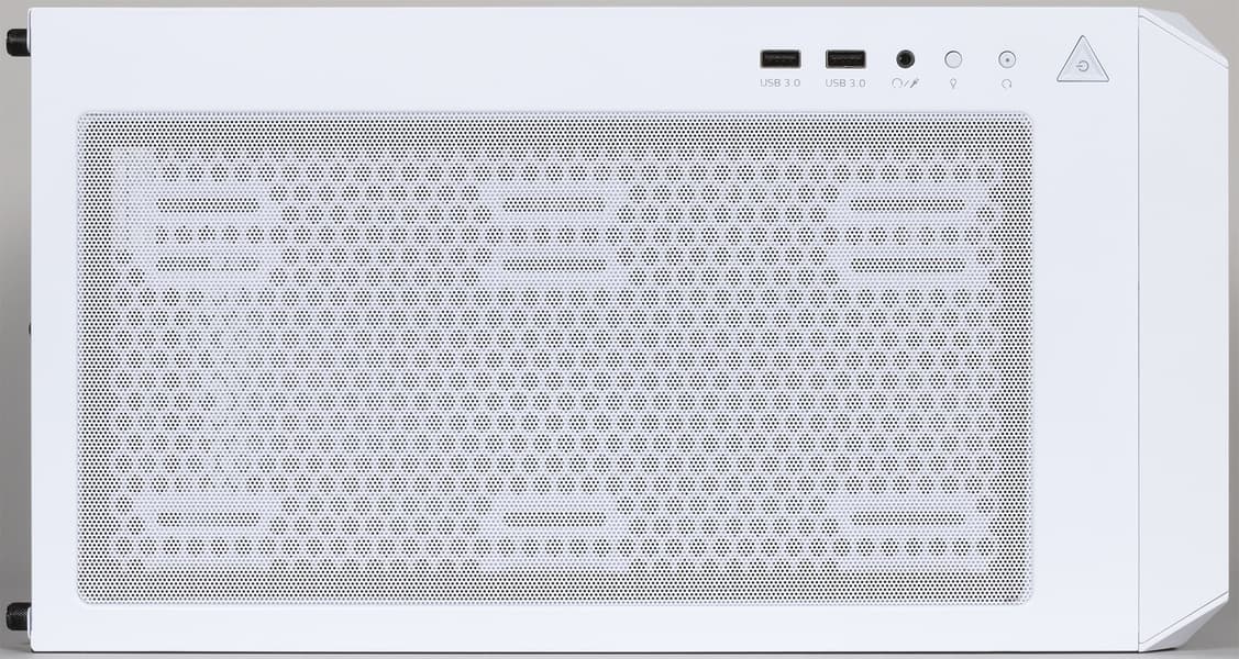 Передняя панель корпуса представляет собой решетку из пересекающихся под углом 60° полос, что придает некоторую свежесть дизайну, хотя сейчас подобное оформление весьма популярно и такие решетки можно встретить далеко не только в корпусах.
