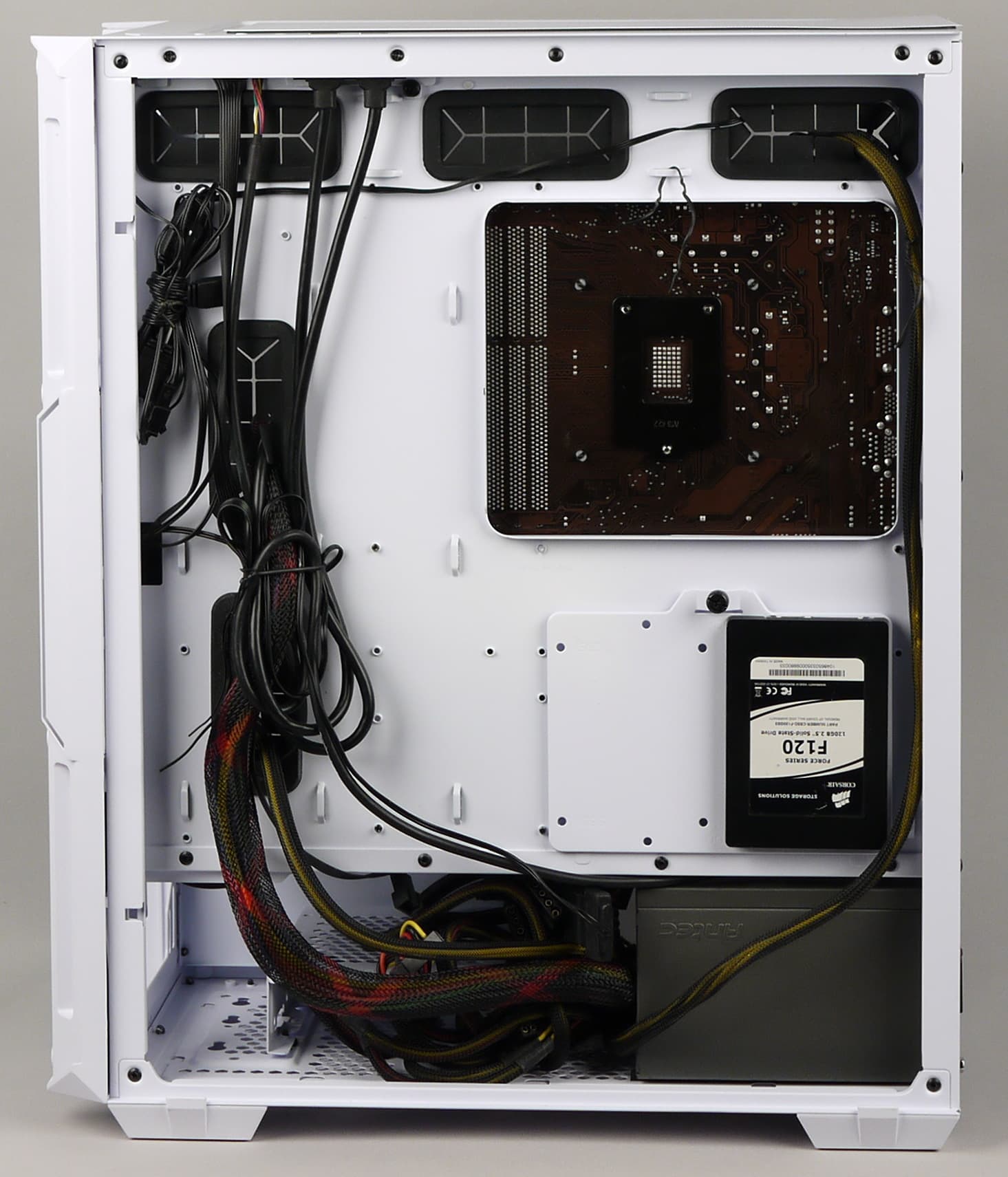 Корпус предусматривает установку блоков питания стандартных размеров. Производитель заявляет возможность установки БП с длиной до 160 мм, расстояние между задней панелью корпуса и дисковой корзиной в штатном положении составляет около 195 мм.