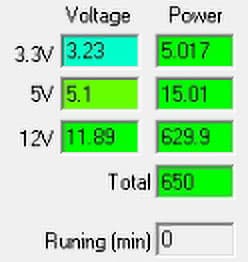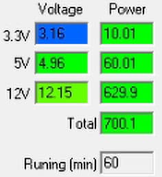 При типичном распределении мощности по каналам отклонения от номинала не превышают 3% по каналу +3.3VDC, 4% по каналу +5VDC и 3% по каналу +12VDC. То есть при реальной эксплуатации параметры вполне пристойные.