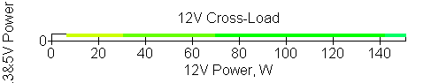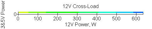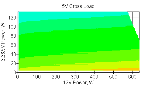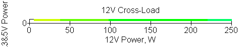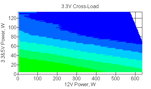 Следующим этапом инструментального тестирования является построение кросснагрузочной характеристики (КНХ) и представление ее на четвертьплоскости, ограниченной максимальной мощностью по шине 3,3&5 В с одной стороны (по оси ординат) и максимальной мощностью по шине 12 В с другой (по оси абсцисс). В каждой точке измеренное значение напряжения обозначается цветовым маркером в зависимости от отклонения от номинального значения.