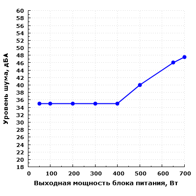 При дальнейшем увеличении выходной мощности уровень шума заметно повышается. При работе на мощности 500 Вт уровень шума данной модели приближается к 40 дБА при расположении БП в ближнем поле, а на мощности 650 Вт уже заметно превышает эргономичный порог в 40 дБА.