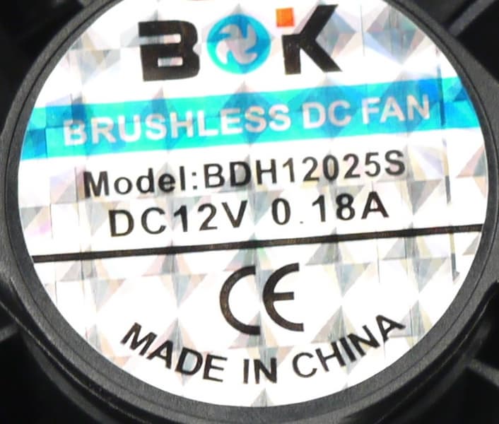 В блоке питания установлен вентилятор BOK BDH12025S типоразмера 120 мм. Вентилятор основан на подшипнике скольжения и имеет, согласно официальным данным, скорость вращения 2000 оборотов в минуту. Подключение двухпроводное через разъем.
