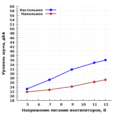 Штатно установленные в корпусе вентиляторы управляются изменением питающего напряжения. Мы оценили шум такого компьютера при изменении напряжения в диапазоне от 5 до 12 В. Уровень шума измерялся в двух точках, приблизительно соответствующих настольному и напольному размещению системного блока.