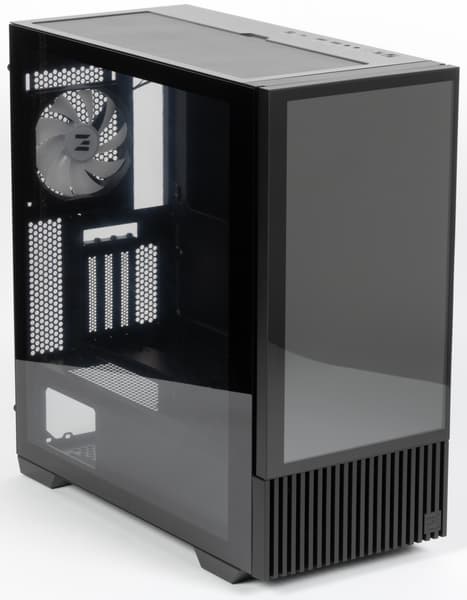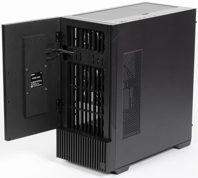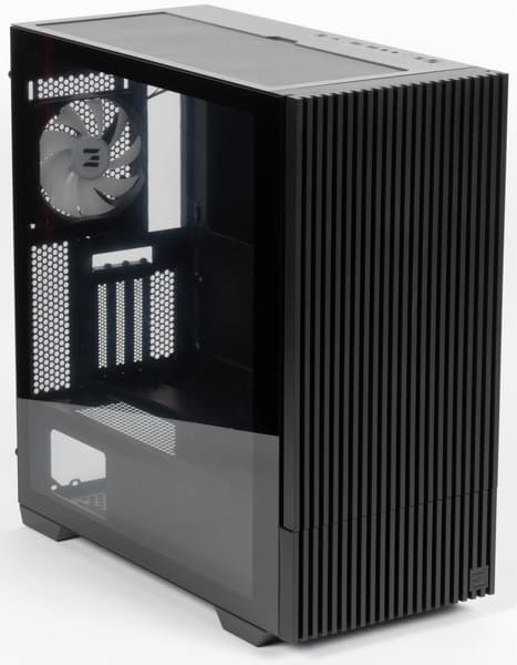 Левая боковая стенка выполнена из тонированного закаленного стекла толщиной 4 мм (по нашему замеру) с оснащенными крепежными элементами стальными накладками впереди и сзади. Фиксируется эта стенка сзади двумя невыпадающими винтами с накатными головками, позволяющими обойтись без отвертки, а спереди имеются два зацепа для крепления к передней кромке шасси.