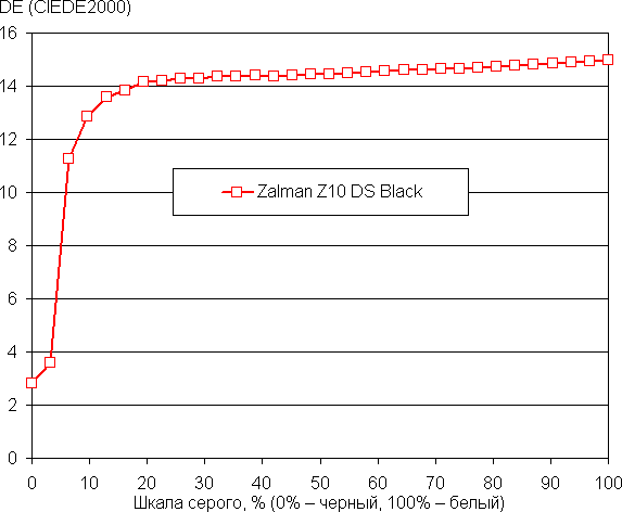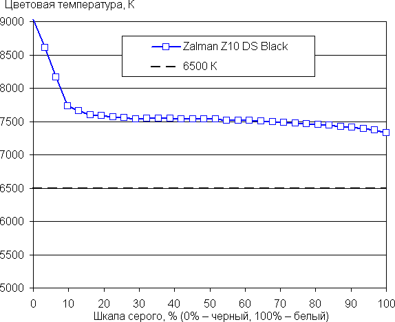 Баланс оттенков на шкале серого средний, так как цветовая температура существенно выше стандартных 6500 К, и отклонение от спектра абсолютно черного тела (ΔE) выше 10, что даже для потребительского устройства считается плохим показателем. Но хотя бы при этом цветовая температура и ΔE мало изменяются от оттенка к оттенку — это положительно сказывается на визуальной оценке цветового баланса. (Самые темные области шкалы серого можно не учитывать, так как там баланс цветов не имеет большого значения, да и погрешность измерений цветовых характеристик на низкой яркости большая.)