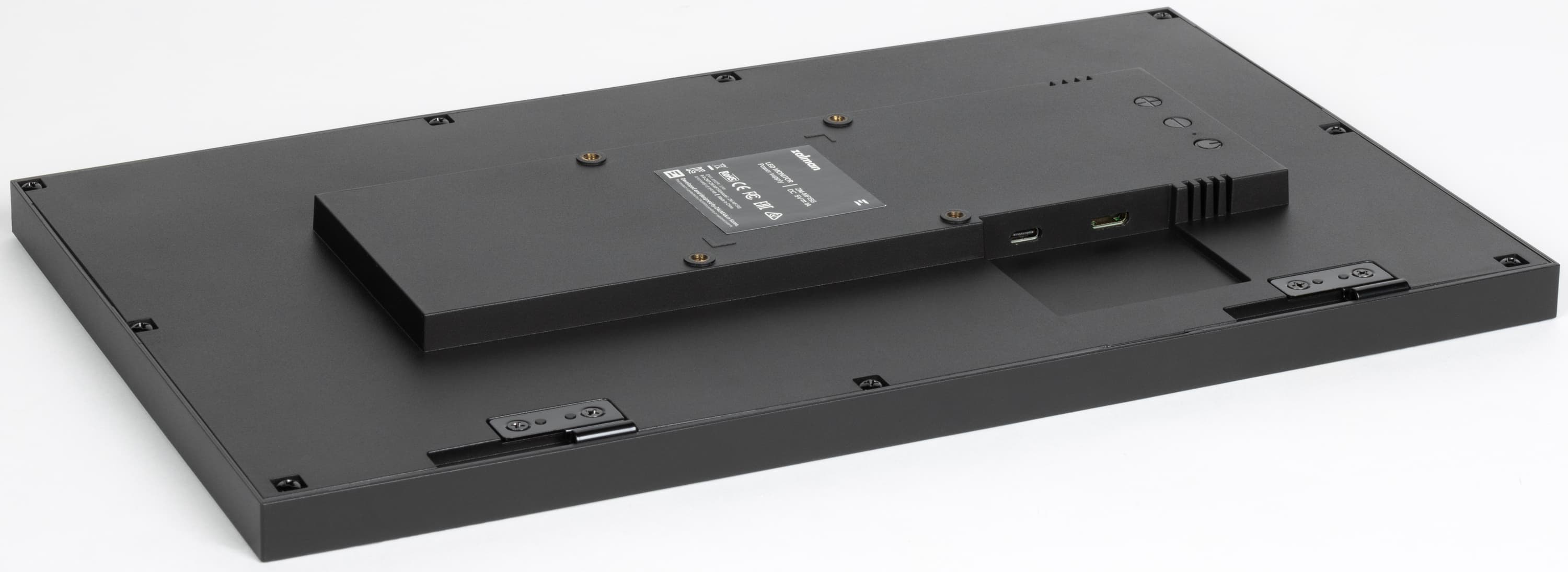 На экране также предусмотрены магниты для фиксации в исходном положении (и тоже без амортизаторов), но и в повернутом состоянии он не болтается: петли довольно тугие, для изменения положения приходится прикладывать небольшое усилие. Правда, крепление в двух точках всё же имеет нежелательные последствия: если стол недостаточно массивный (а именно такой бывает современная офисная мебель), то любой толчок по нему заставит повернутый экран некоторое время вибрировать — эффект не самый приятный, но вполне терпимый.