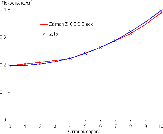 Рост скорости изменения яркости на шкале серого в основном равномерный, и каждый следующий оттенок ярче предыдущего. В самой темной области аппаратно и визуально хорошо различаются все оттенки: