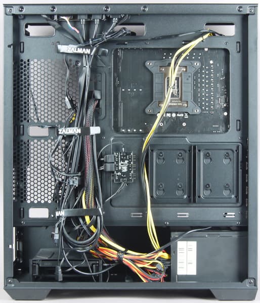 Между основанием для системной платы и правой боковой стенкой остается около 22 мм, чего вполне достаточно для прокладки кабелей. Для их аккуратного монтажа предусмотрены три ленты-«липучки» и штампованные «ушки», а в комплекте есть восемь одноразовых стяжек.