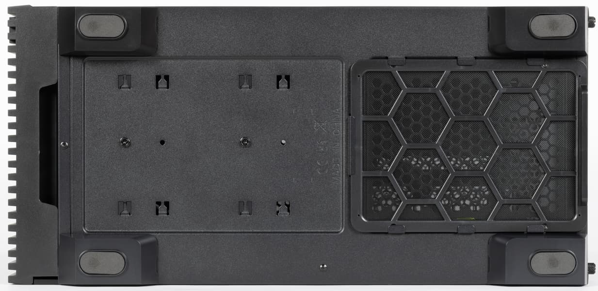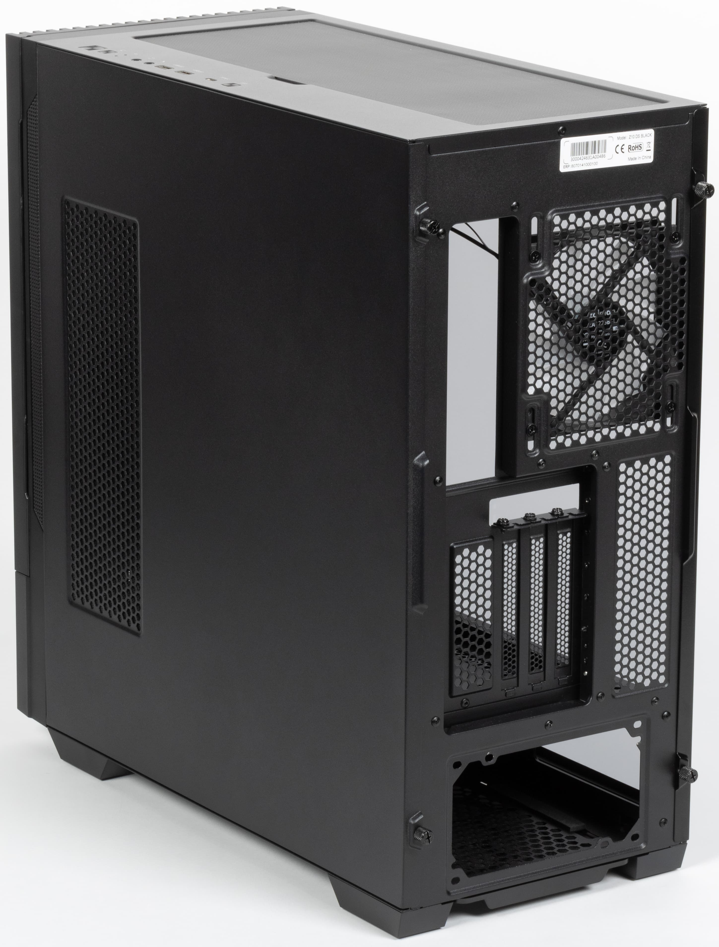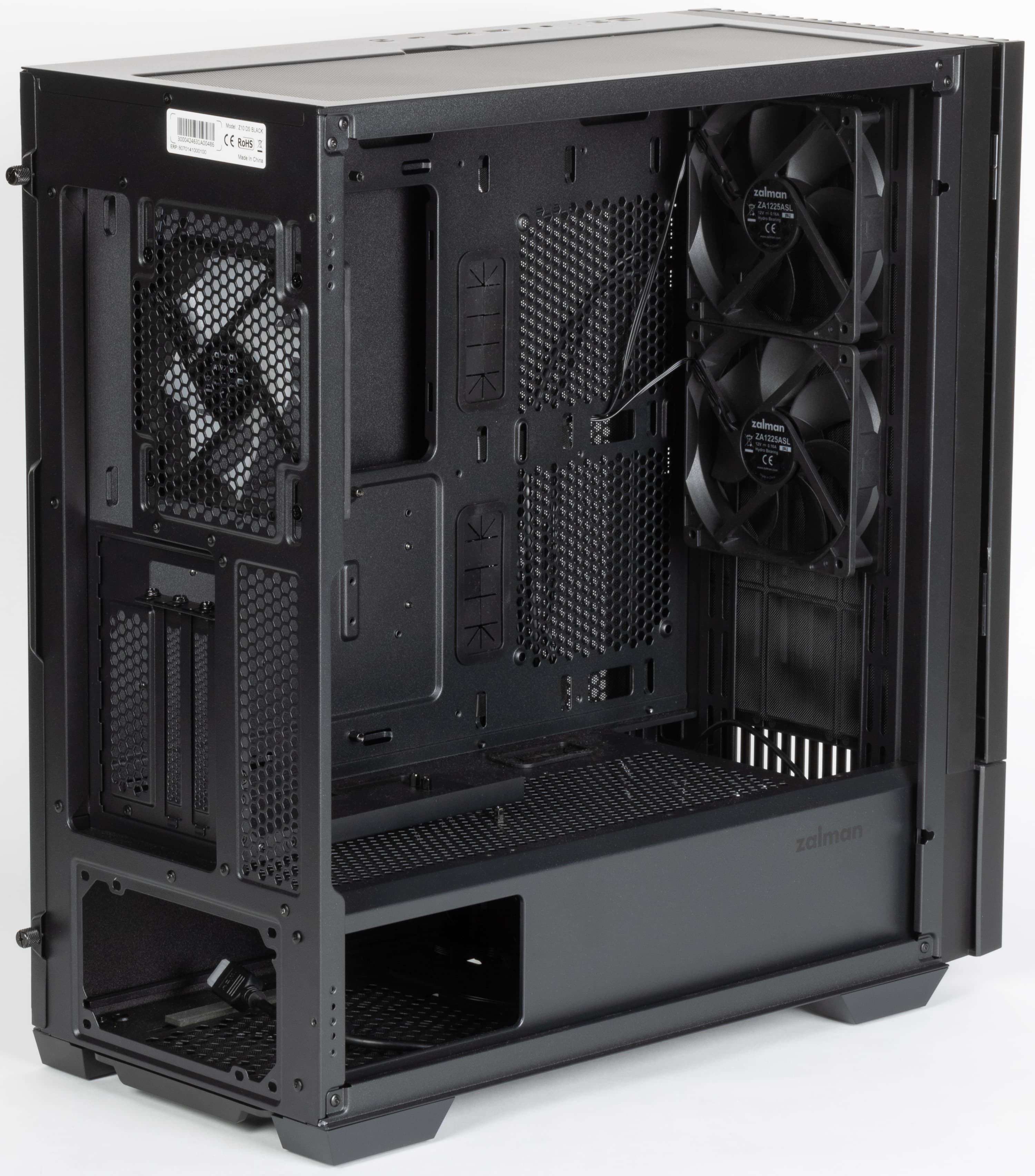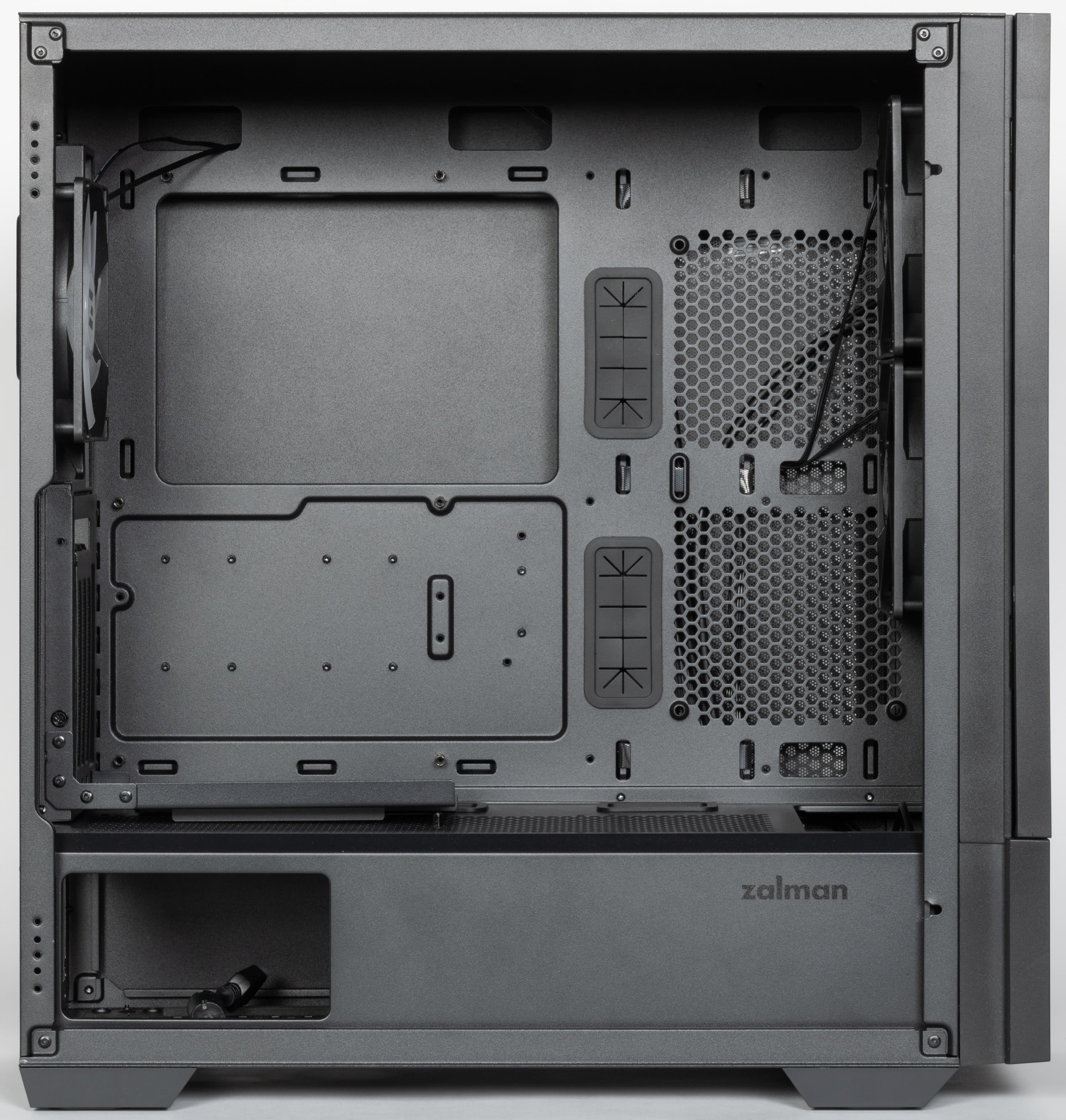 По высоте корпус разбит на два объема, которые разделяются перегородкой с отверстиями, вентиляционными и для кабелей, закрывающей место установки блока питания и со стороны прозрачной стенки. В верхнем вертикально размещается системная плата форматом до ATX включительно с платами расширения, в нижнем горизонтально устанавливается блок питания и имеется корзина для 3,5/2,5-дюймовых накопителей. А для установки 2,5-дюймовых HDD/SSD есть дополнительные крепления на оборотной стороне основания для системной платы. Посадочные места для накопителей с внешним доступом в корпусе отсутствуют.