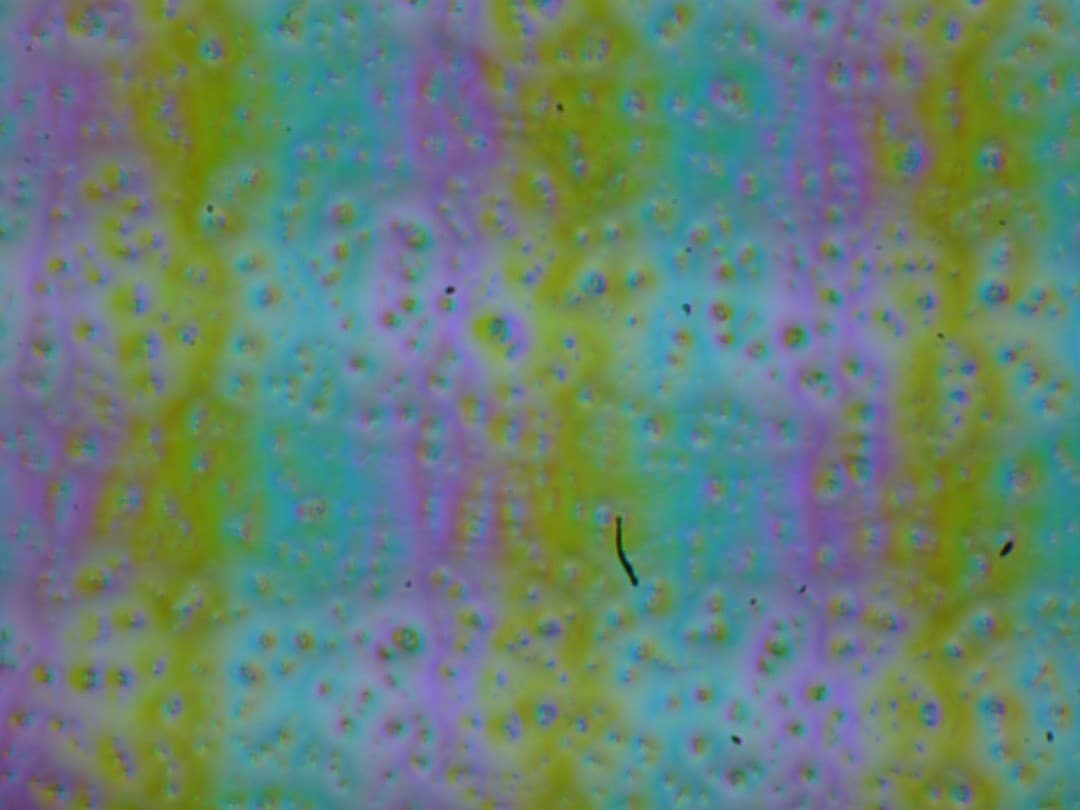 Зерно этих дефектов в несколько раз меньше размеров субпикселей (масштаб этих двух фотографий примерно одинаковый), поэтому фокусировка на микродефектах и «перескок» фокуса по субпикселям при изменении угла зрения выражены слабо, из-за этого нет и «кристаллического» эффекта, но некая вариация яркости и оттенка на уровне пикселей всё же есть.