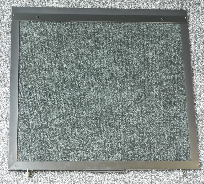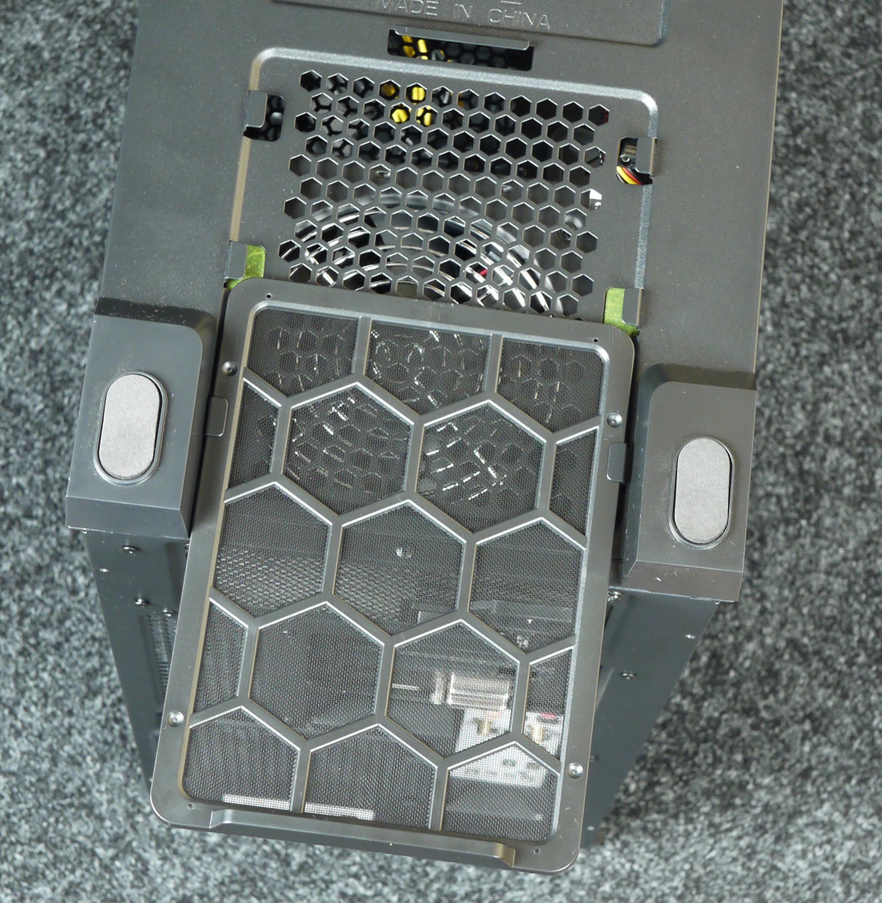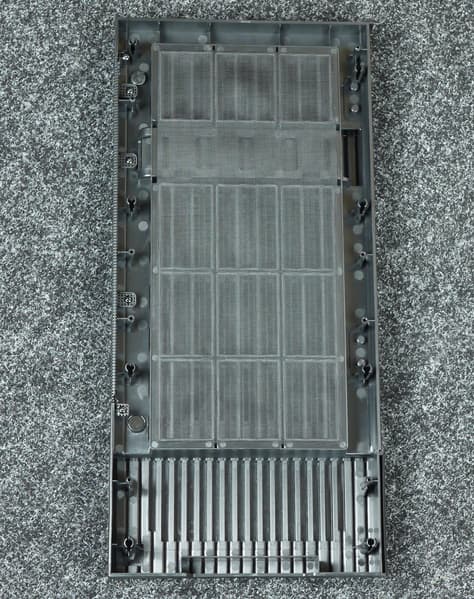 Предусмотрены фильтры, наиболее удобно обслуживать верхний — это лист из черного гибкого пластика с мелкими круглыми отверстиями, который снаружи удерживается на металле верхней плоскости шасси с помощью закрепленных по всему периметру магнитных полос.