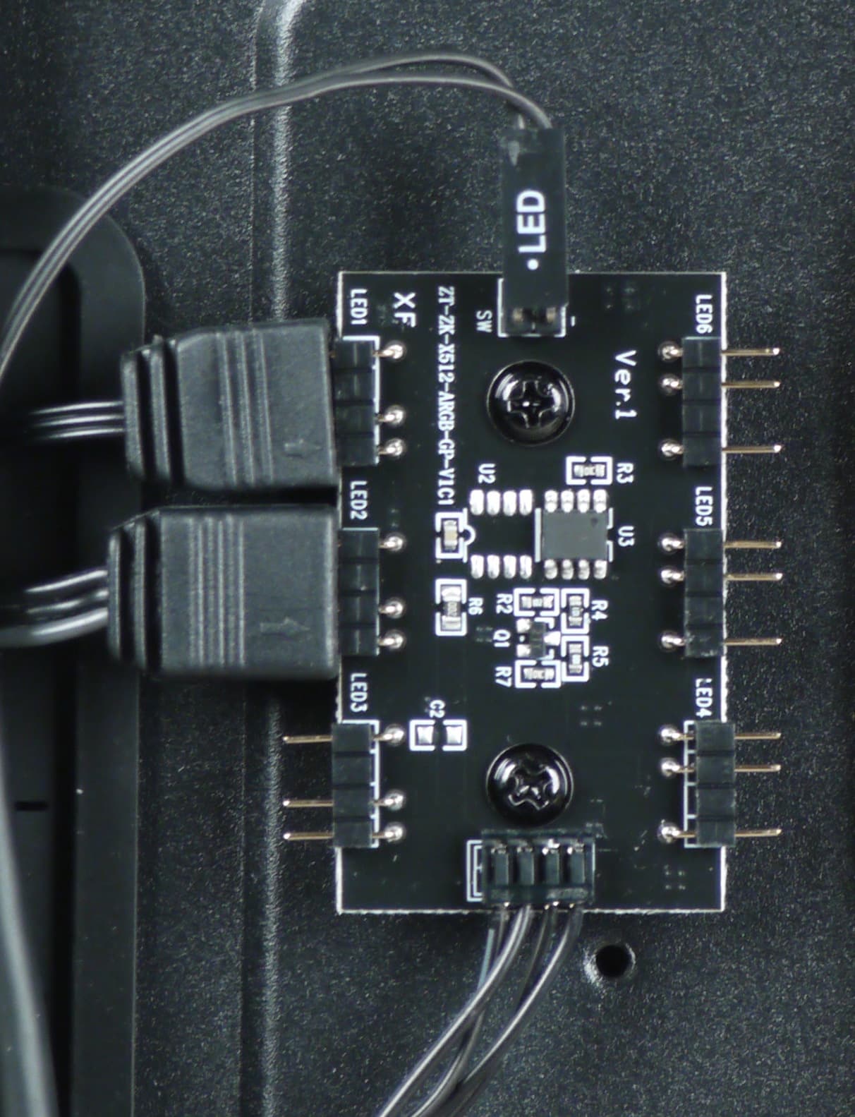 Имеется и собственный ARGB-контроллер, управляющий системой подсветки и позволяющий подключать до шести элементов (в том числе только что упомянутый вентилятор). Режимы выбираются кнопкой «LED», расположенной на панели управления корпуса, и включают как различные световые эффекты, так и постоянные цвета.