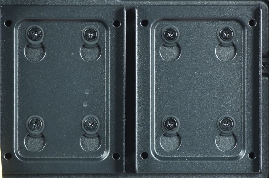Во-первых, с обратной стороны основания для системной платы имеются две монтажные пластины с бортиками, на которых можно закрепить (винтами снизу) по одному 2,5-дюймовому накопителю. Крепятся эти пластины выступающими из плоскости основания винтами с фигурными резиновыми накладками, обеспечивающими и амортизацию, и надежную фиксацию; для снятия отвертка не потребуется, достаточно с усилием сдвинуть пластину вверх.