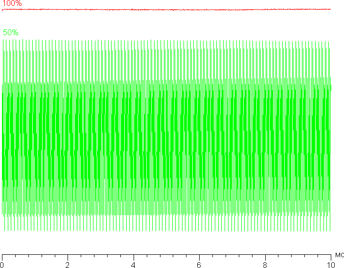 Только на пониженном уровне яркости появляется значимая модуляция подсветки, но частота модуляции очень высокая (30 кГц), поэтому никакого обнаруживаемого визуально мерцания нет. В доказательство приведем графики зависимости яркости (вертикальная ось) от времени (горизонтальная ось) при различных значениях настройки яркости: