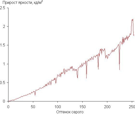 Далее мы измерили яркость 256 оттенков серого (от 0, 0, 0 до 255, 255, 255). График ниже показывает скорость изменения (не абсолютное значение!) яркости между соседними полутонами: